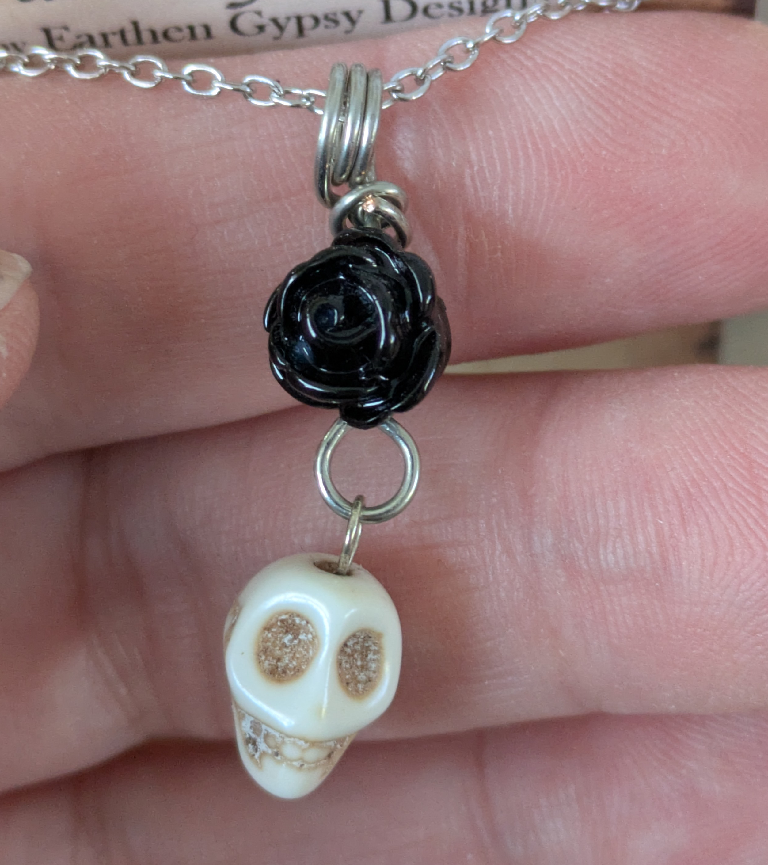 Dainty necklace made with a acrylic black rose bead and howlite skull bead.