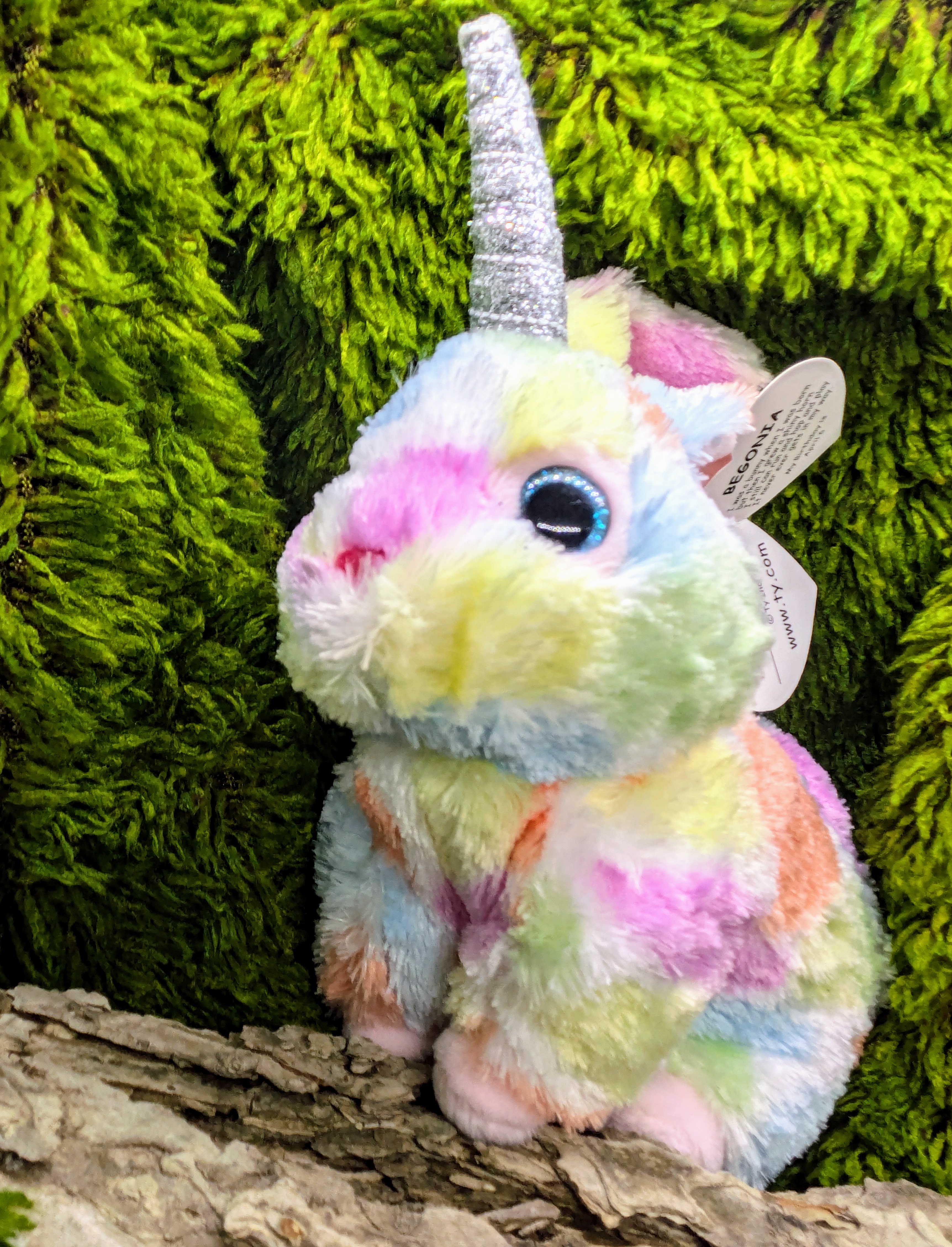 This adorable cross between a bunny and a unicorn is named Begonia. She has lots of pretty pastel patches all over her white body and a lovely silver horn. She would love to be your friend.