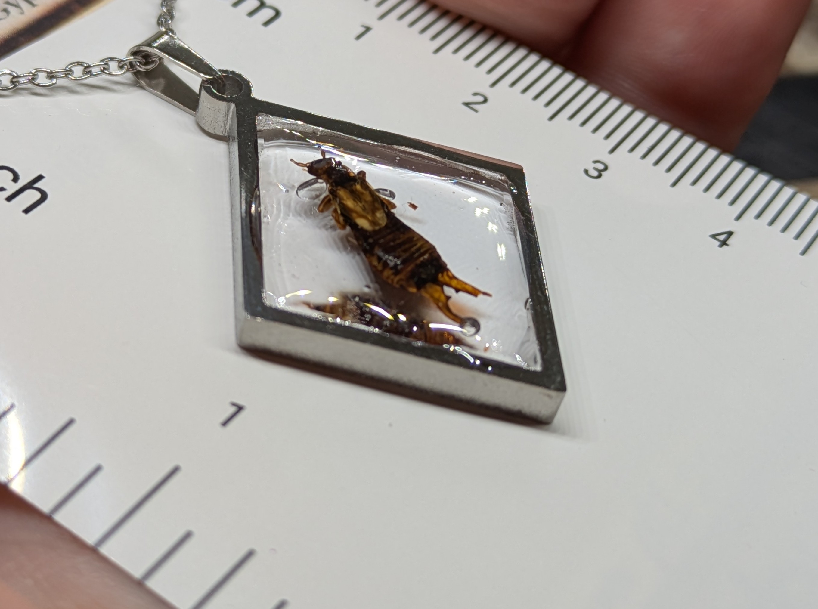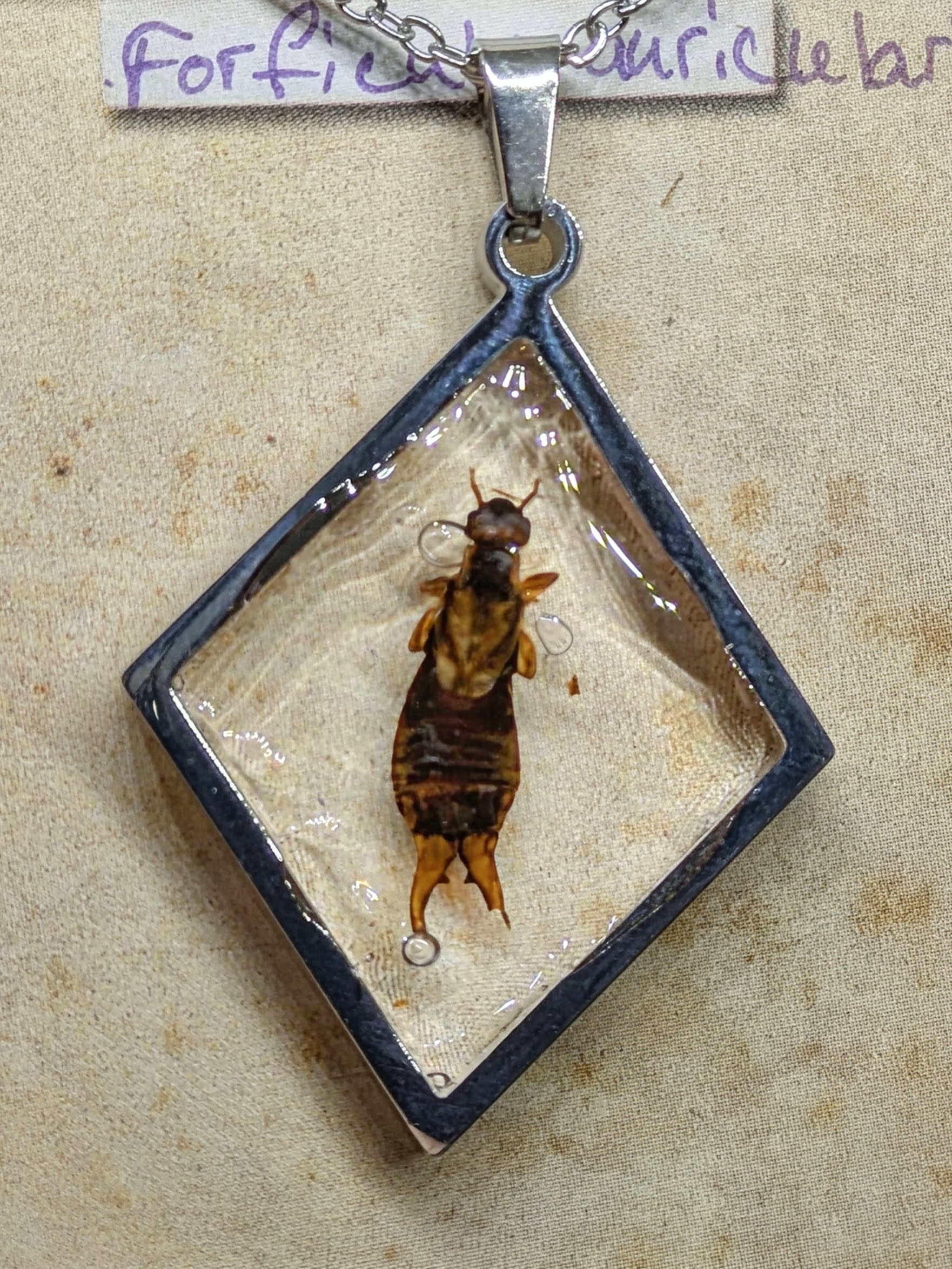 This necklace is made with a real bug in it - the Common Earwig, Forficula auricularia. This unusual piece of jewelry makes a unique gift and a great conversation starter. The pendant is reversible and only framed in metal so you can view both the front and back of the bug.