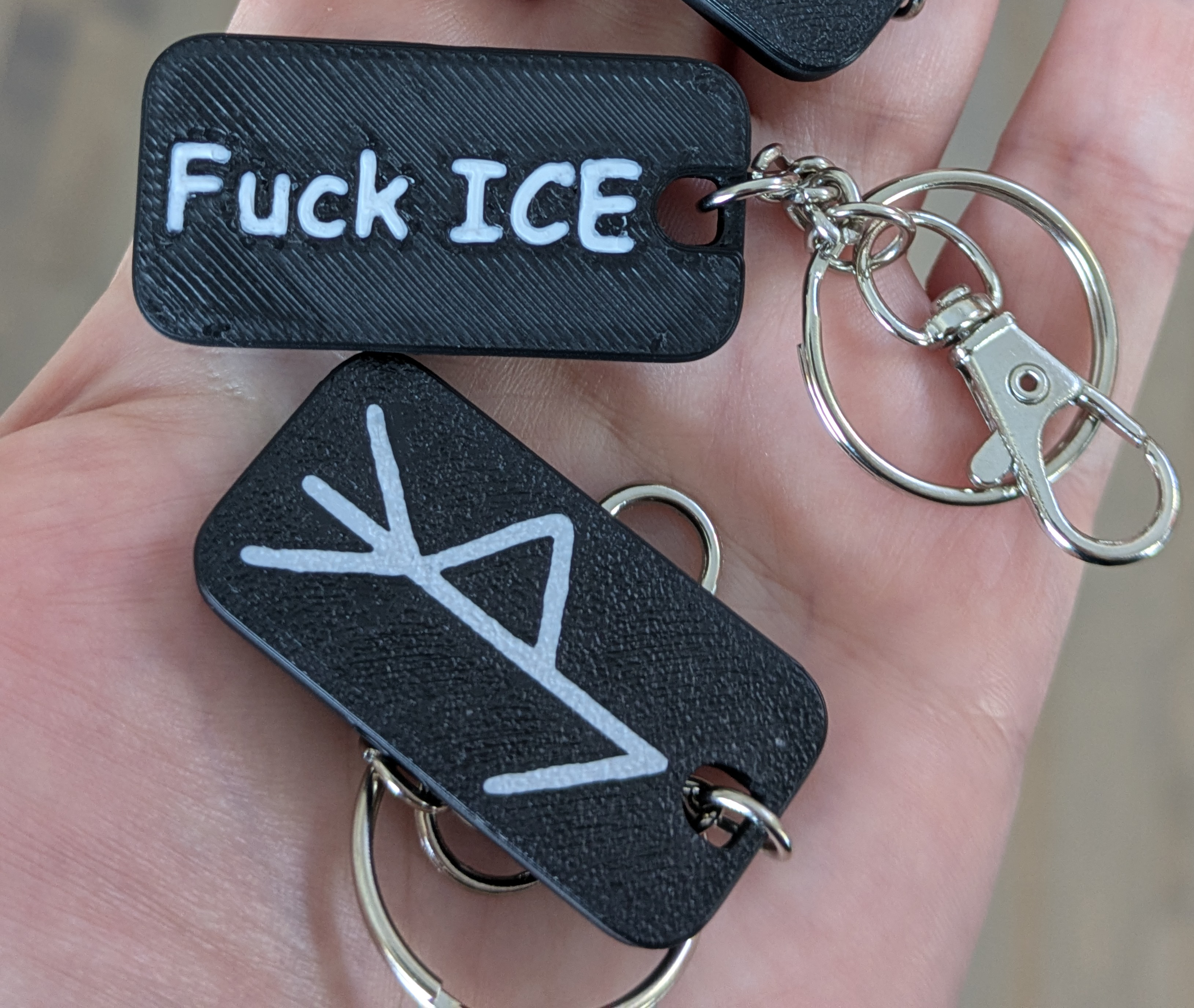 All whistles say "Fuck ICE" on one side and a viking rune on the other side that means 'Fuck Off'.