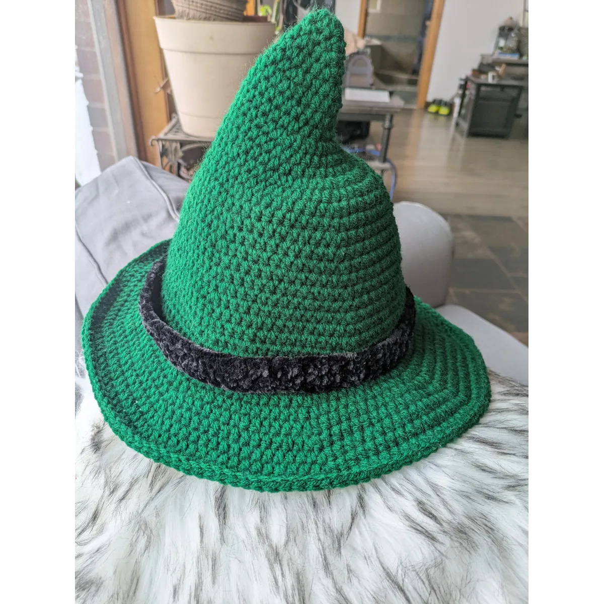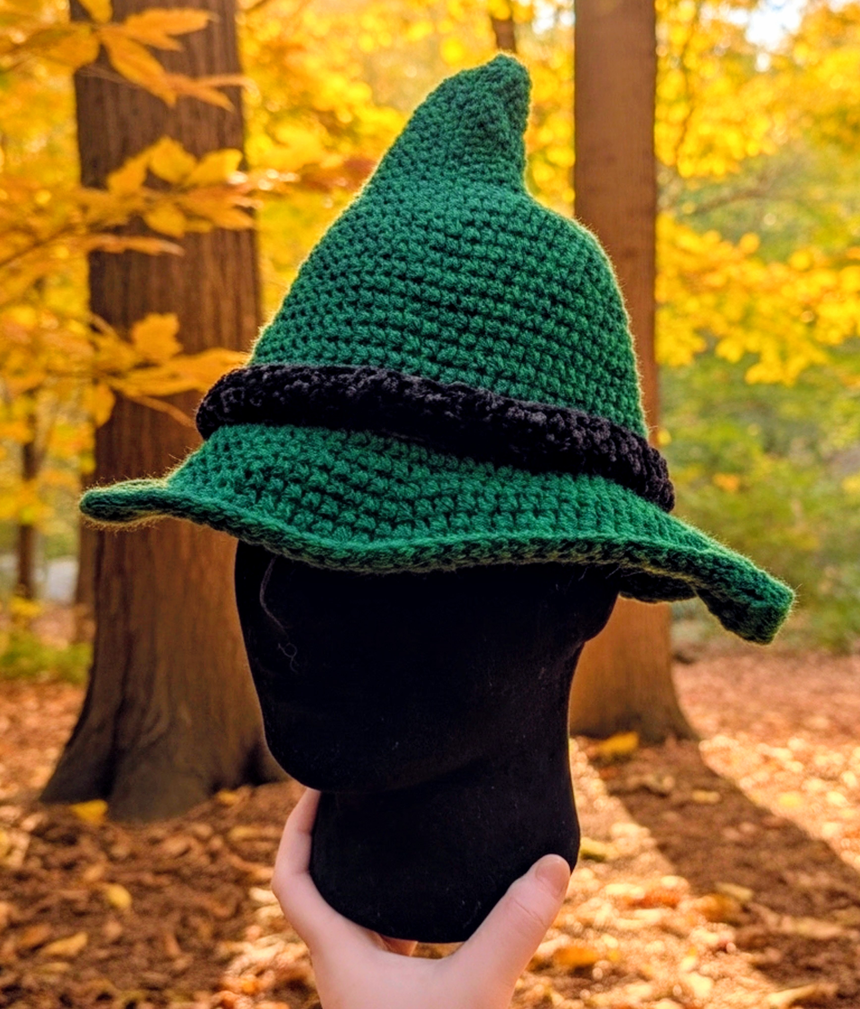 Crochet hedge witch hat. Available with or without contrasting accent band.