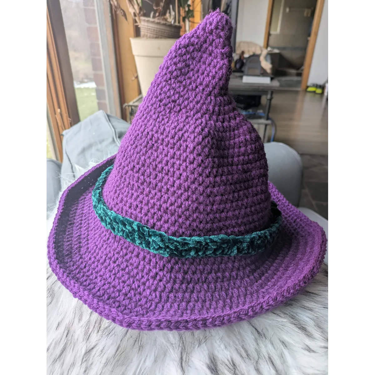 Crochet hedge witch hat. Available with or without contrasting accent band.