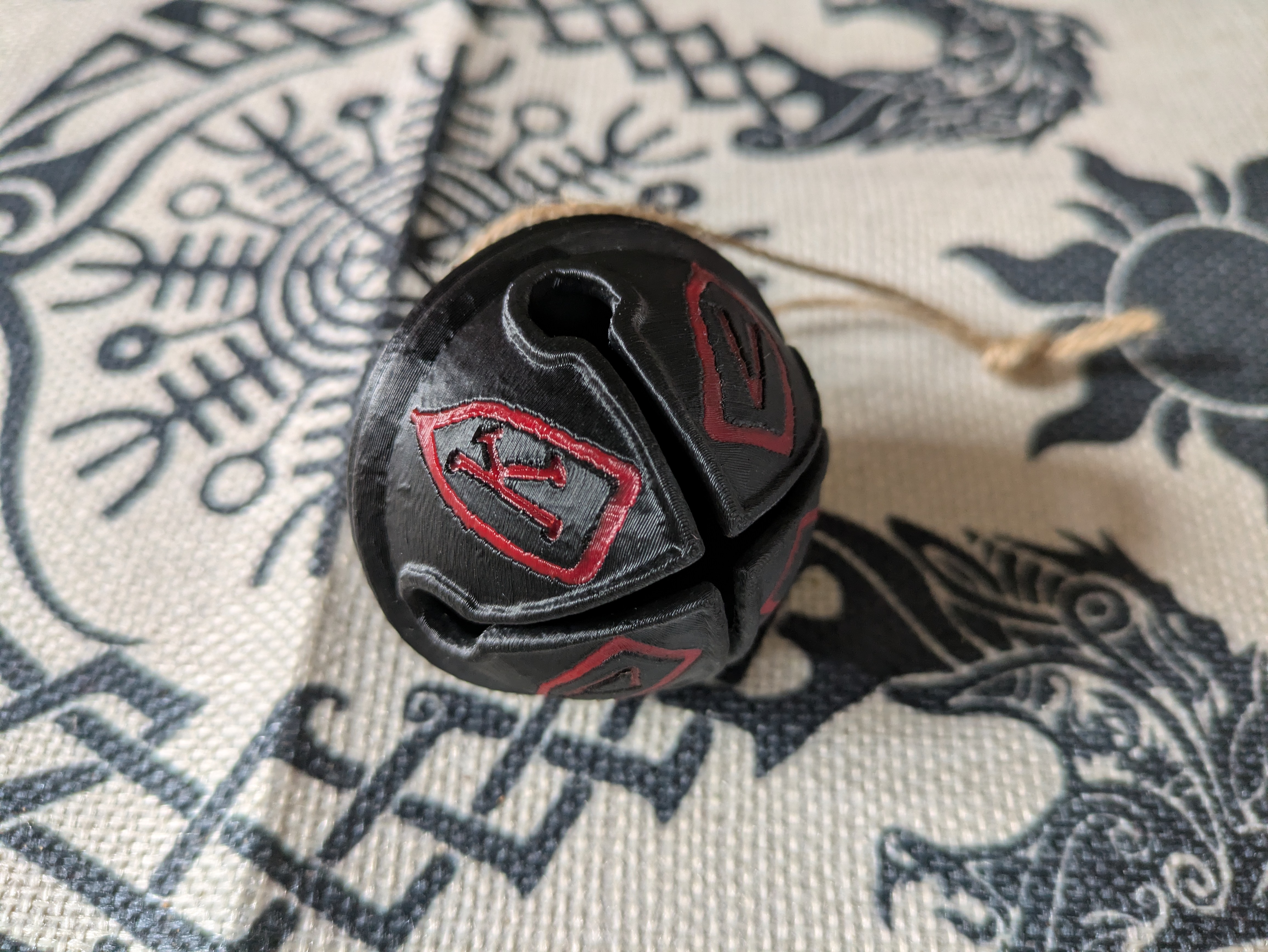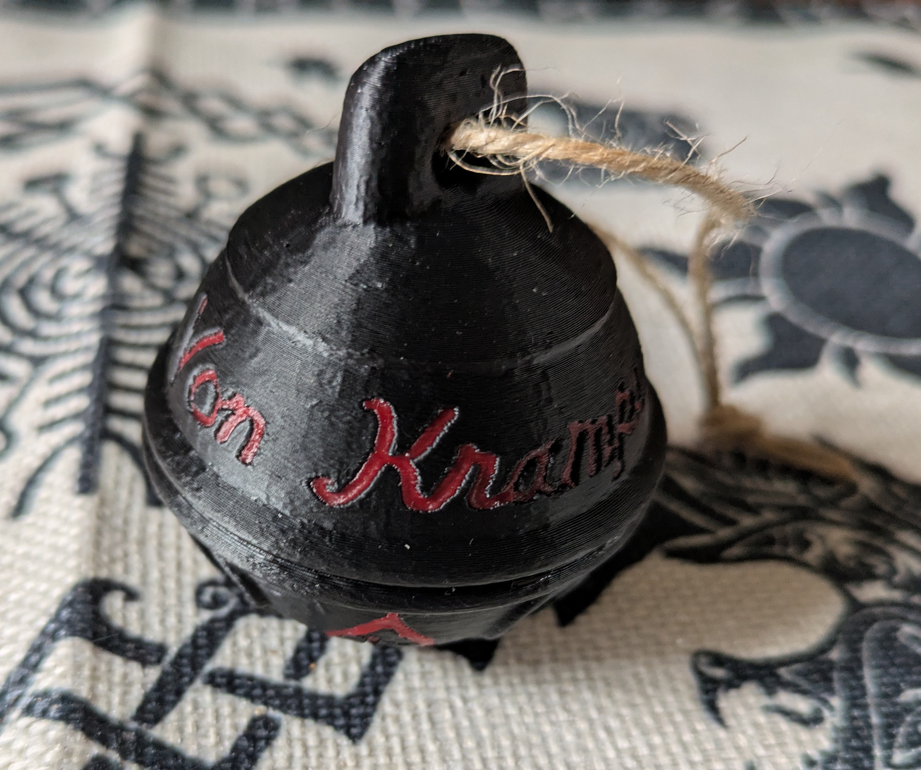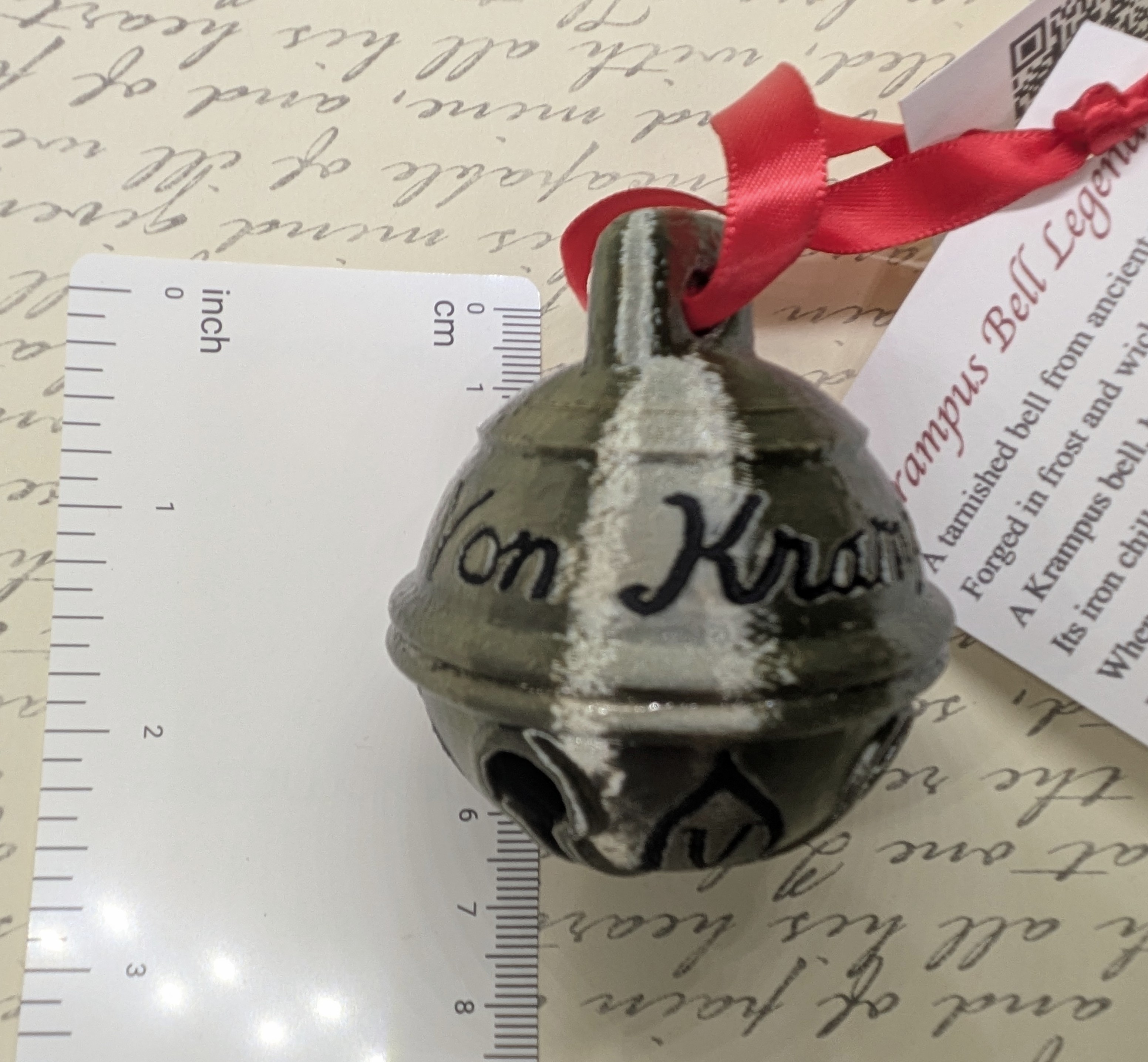 3D printed Krampus bell. Top of the bell says "Gruss van Krampus", which means "Greetings from Krampus". Bottom of the bell has 4 runes on it.