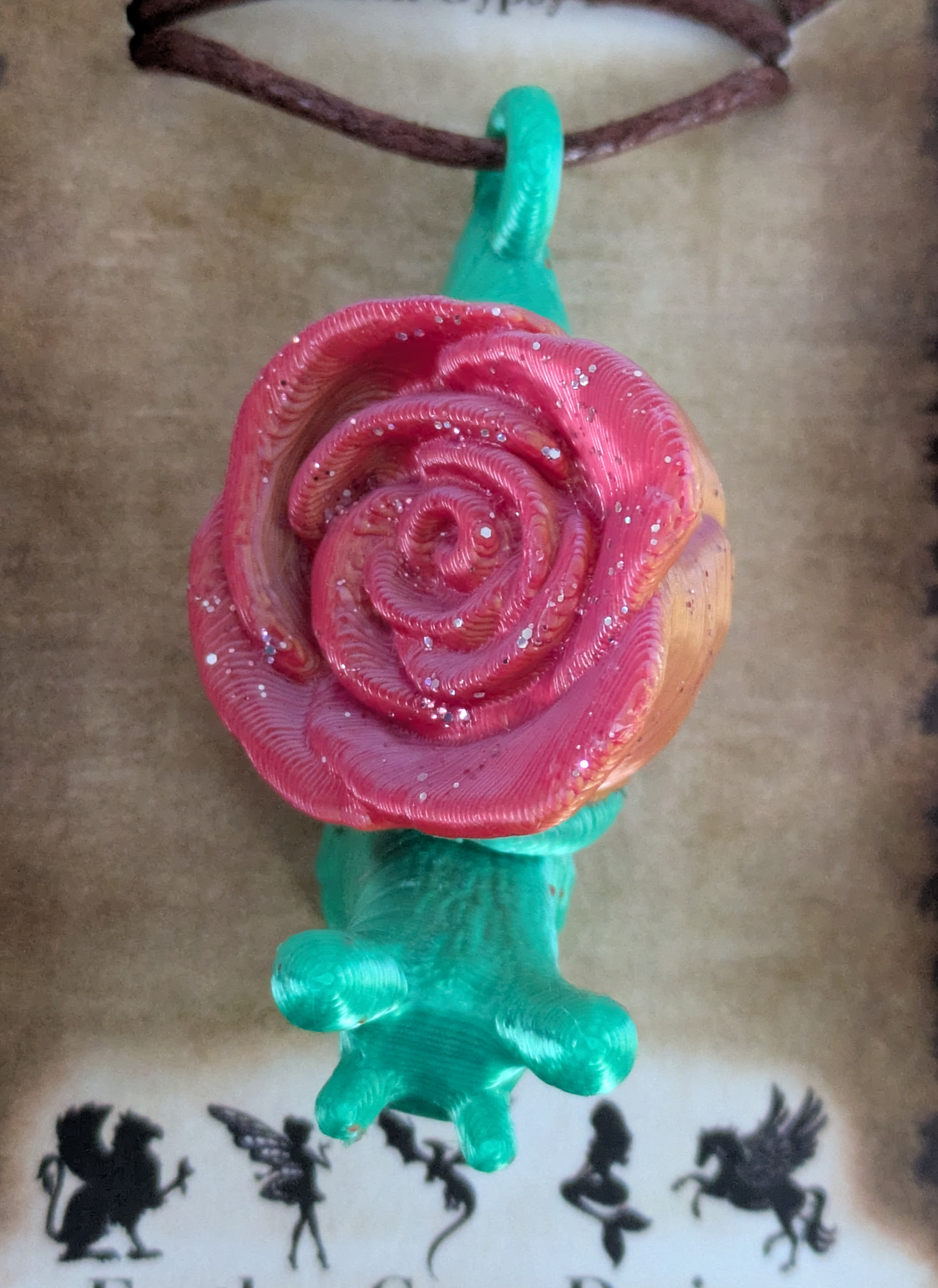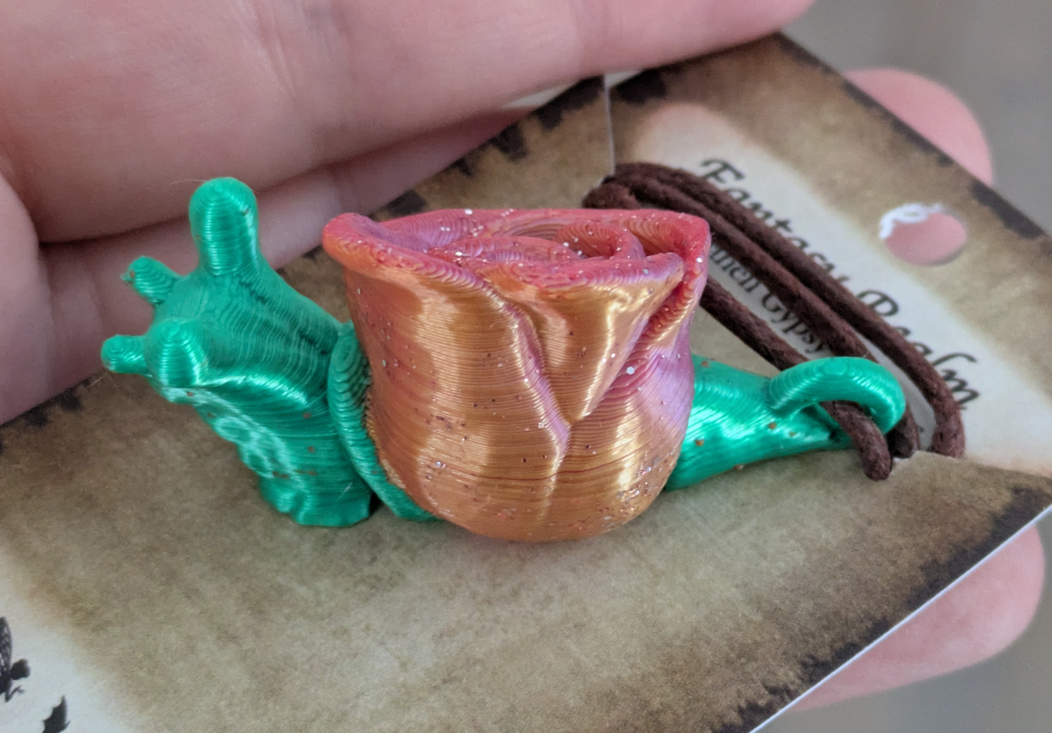 Small rose snails. 3d printed with hand painted accents. Snails are articulated in a on each side of the rose.