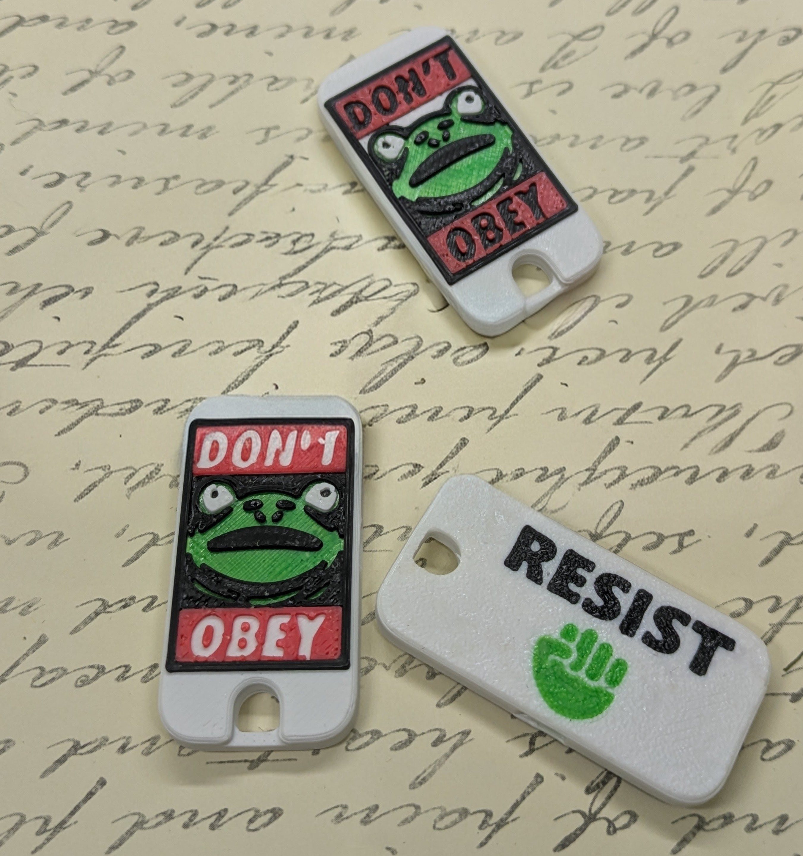 Antifa frog whistle has frog on one side and resist with fist on the back.