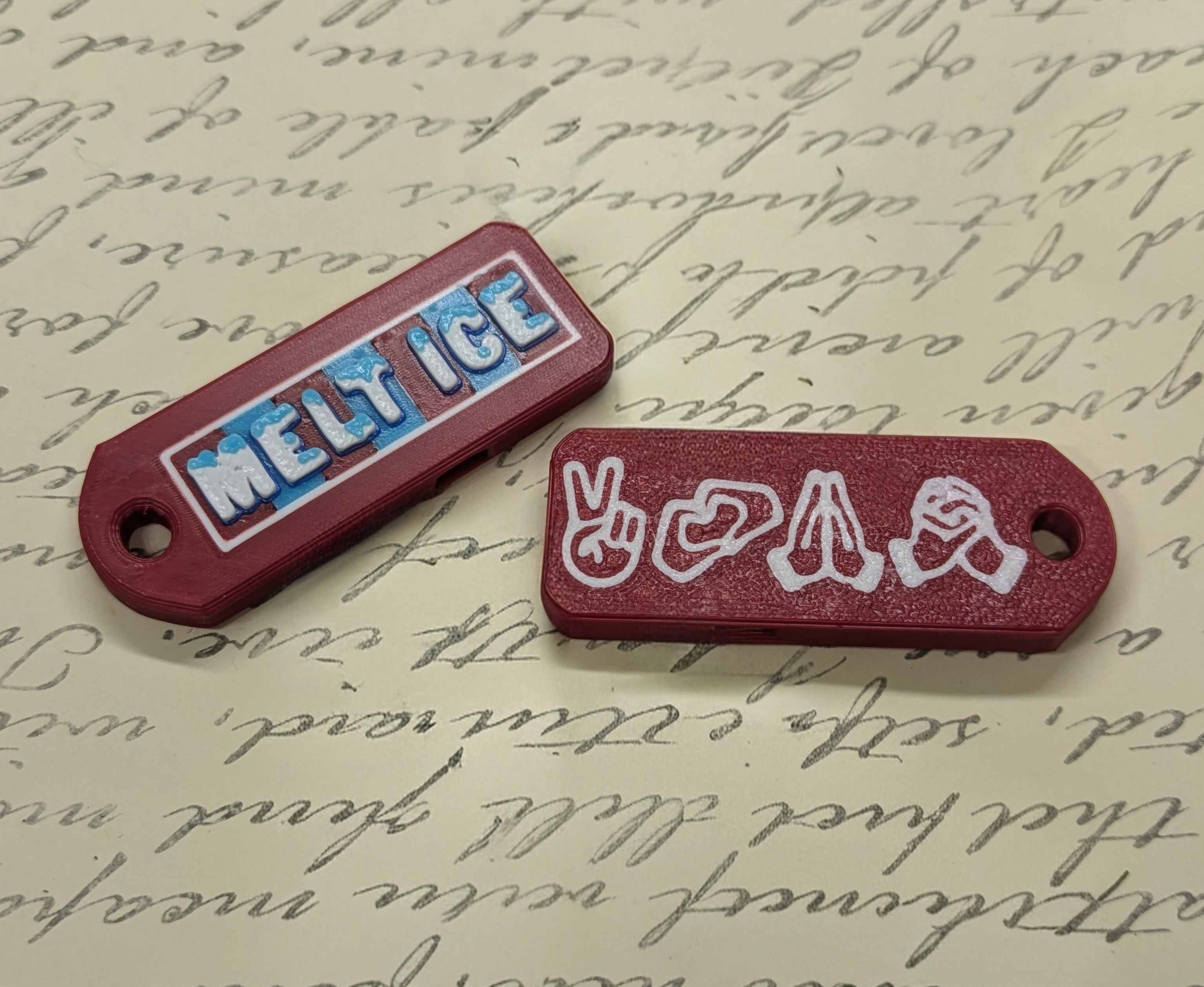 Melt ICE whistle has melt ICE on one side and love in sign language on the back.