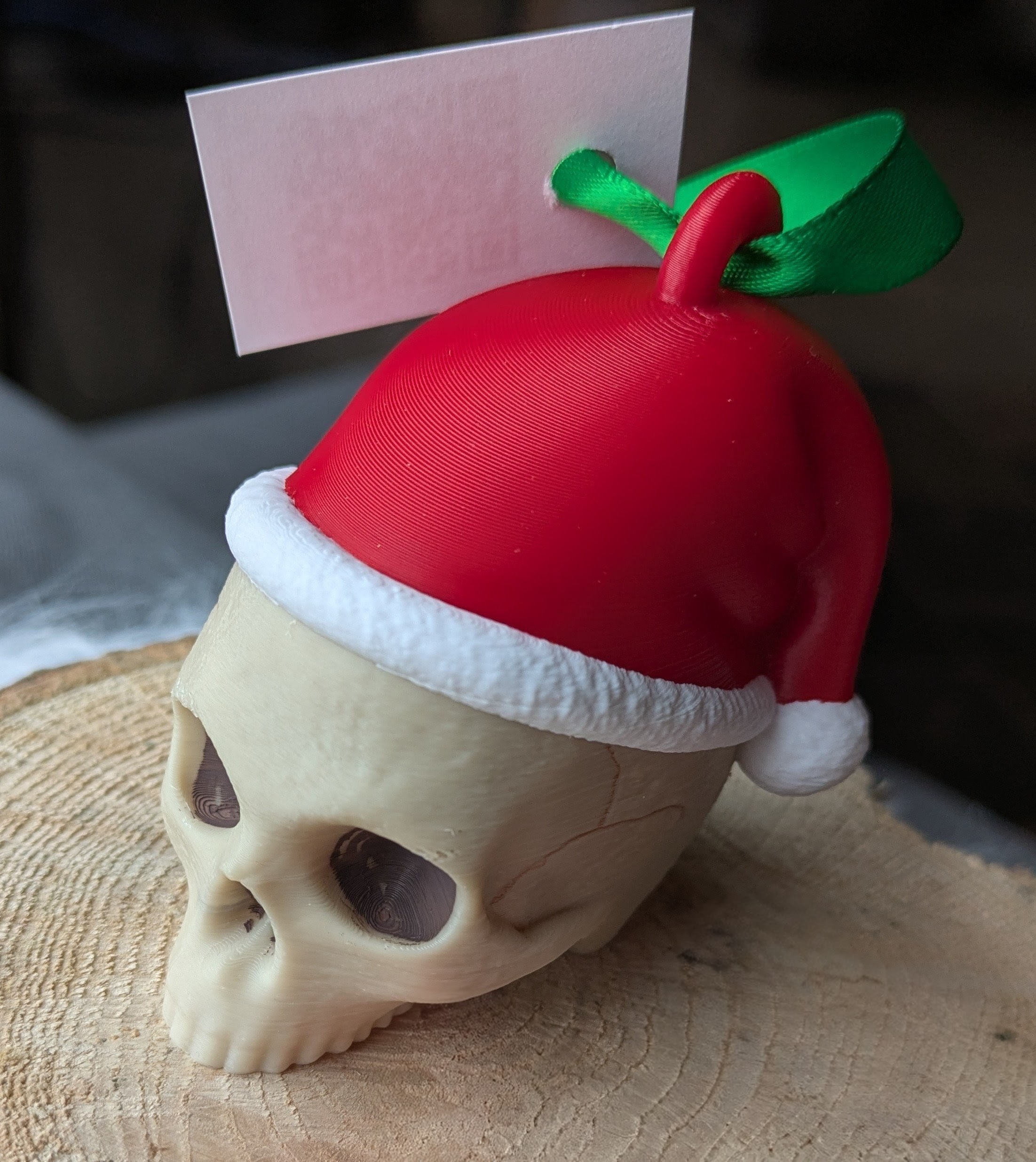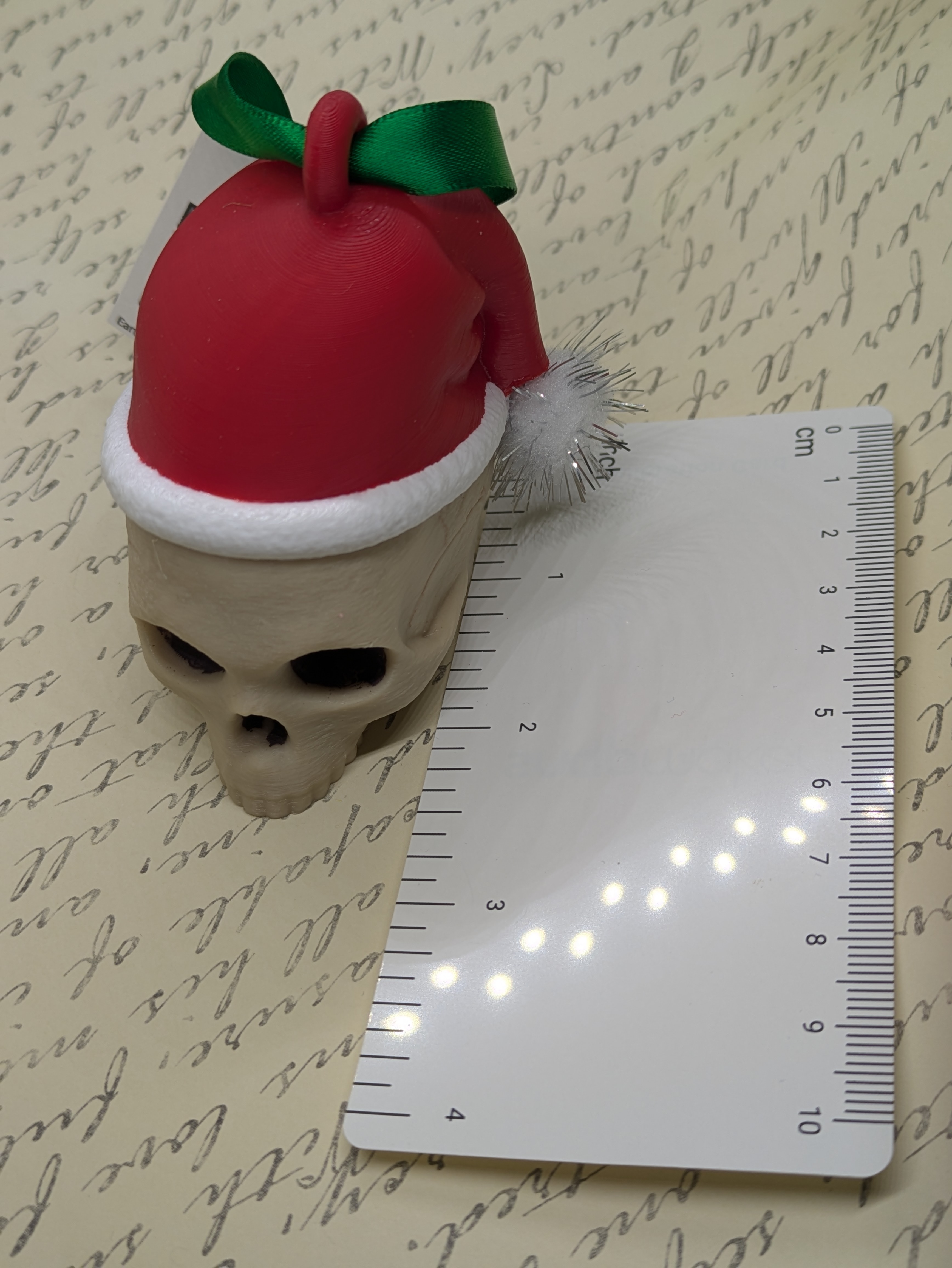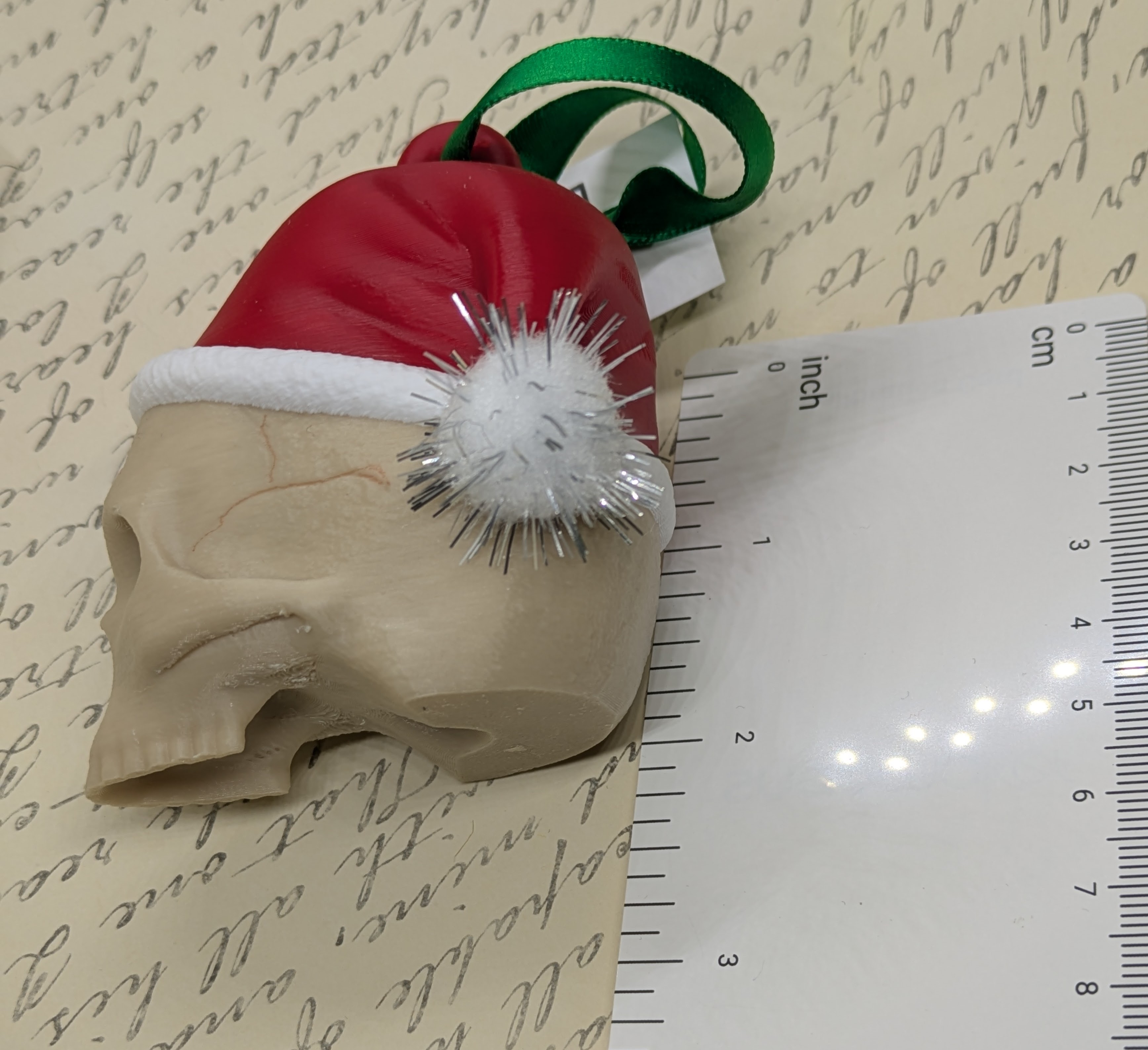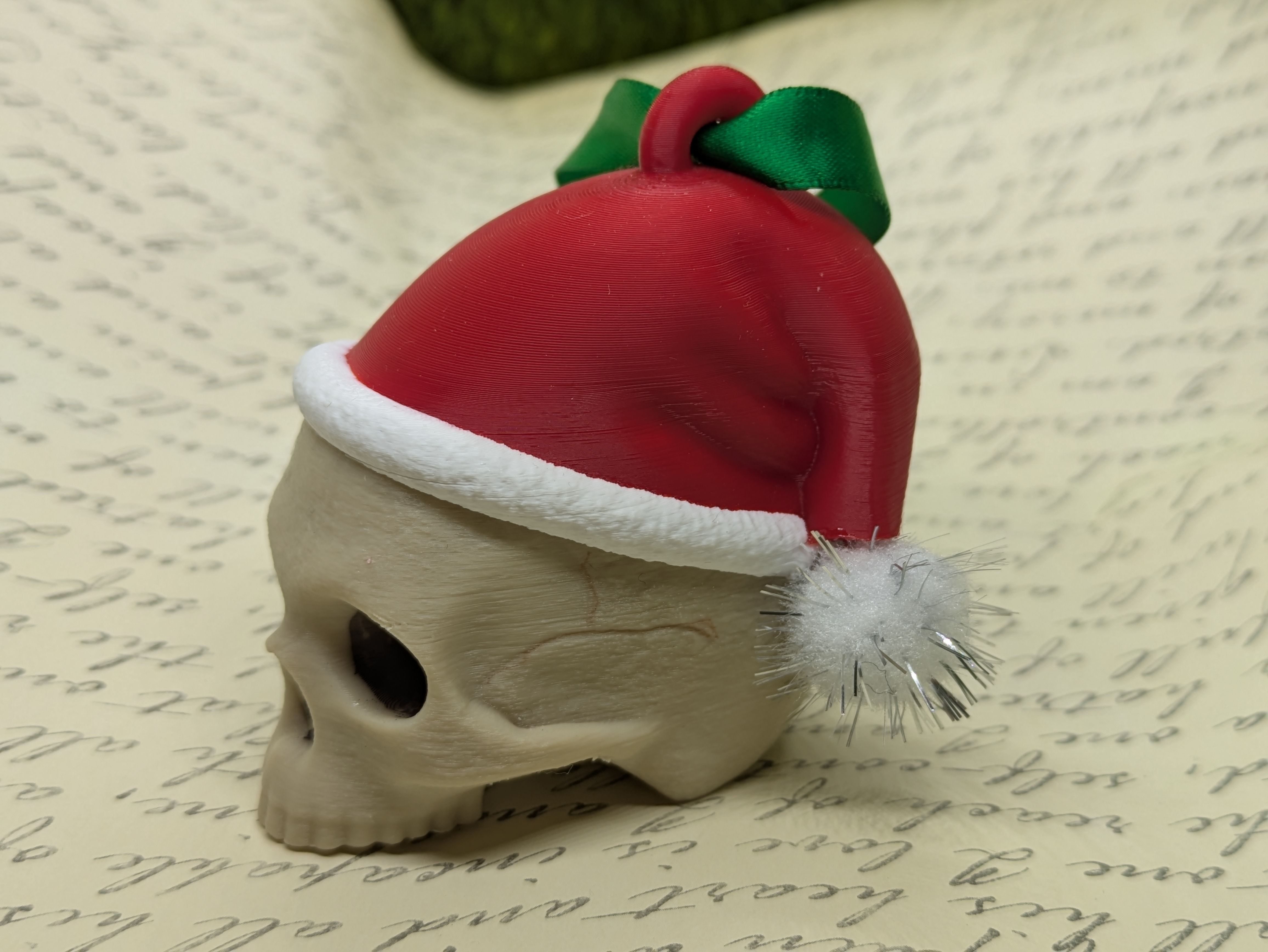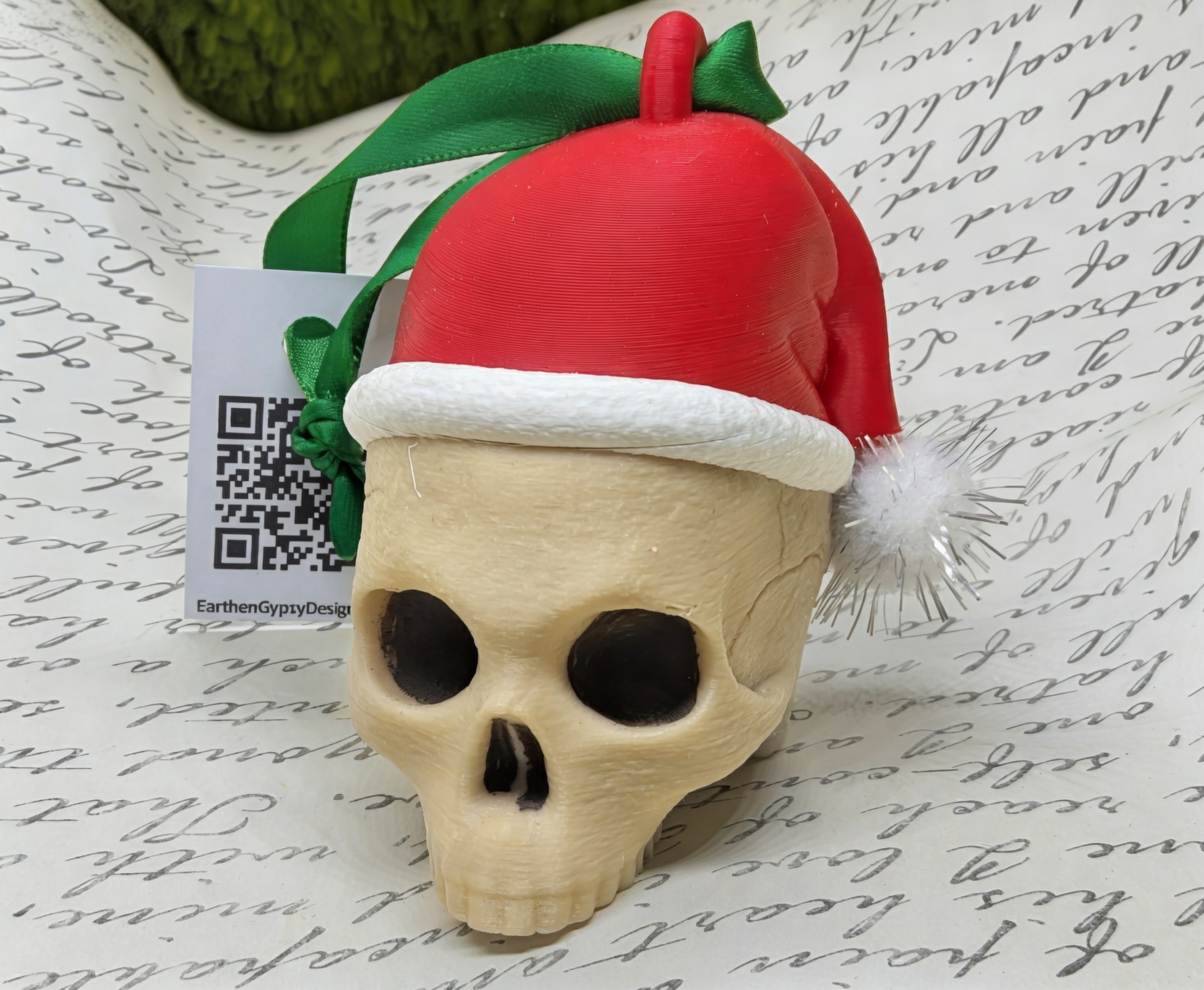 Santa skull ornament. Comes on a green ribbon. With or without sparkly pompom on hat.