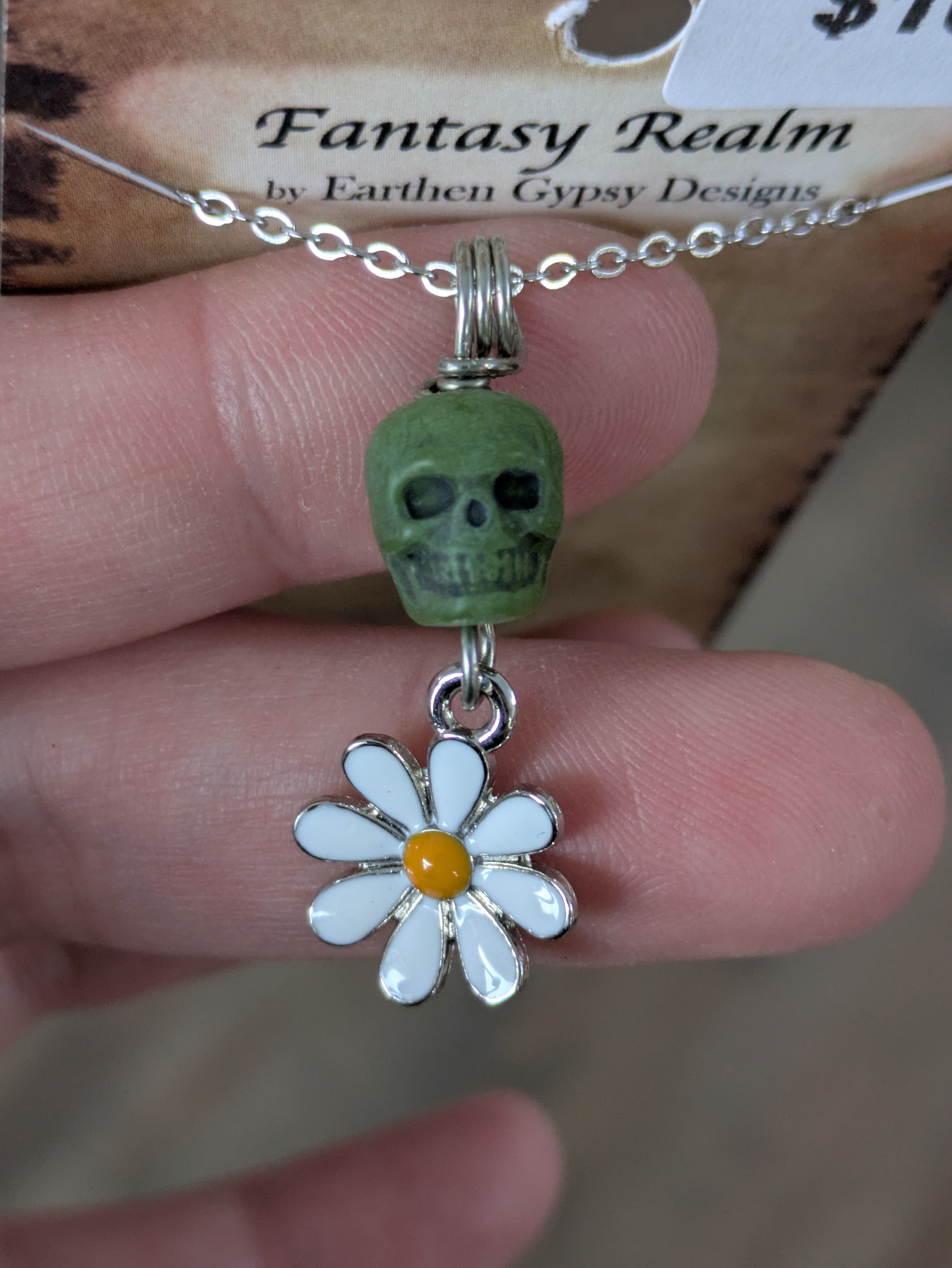 Dainty necklace made with a acrylic skull bead and metal enamel daisy charm.