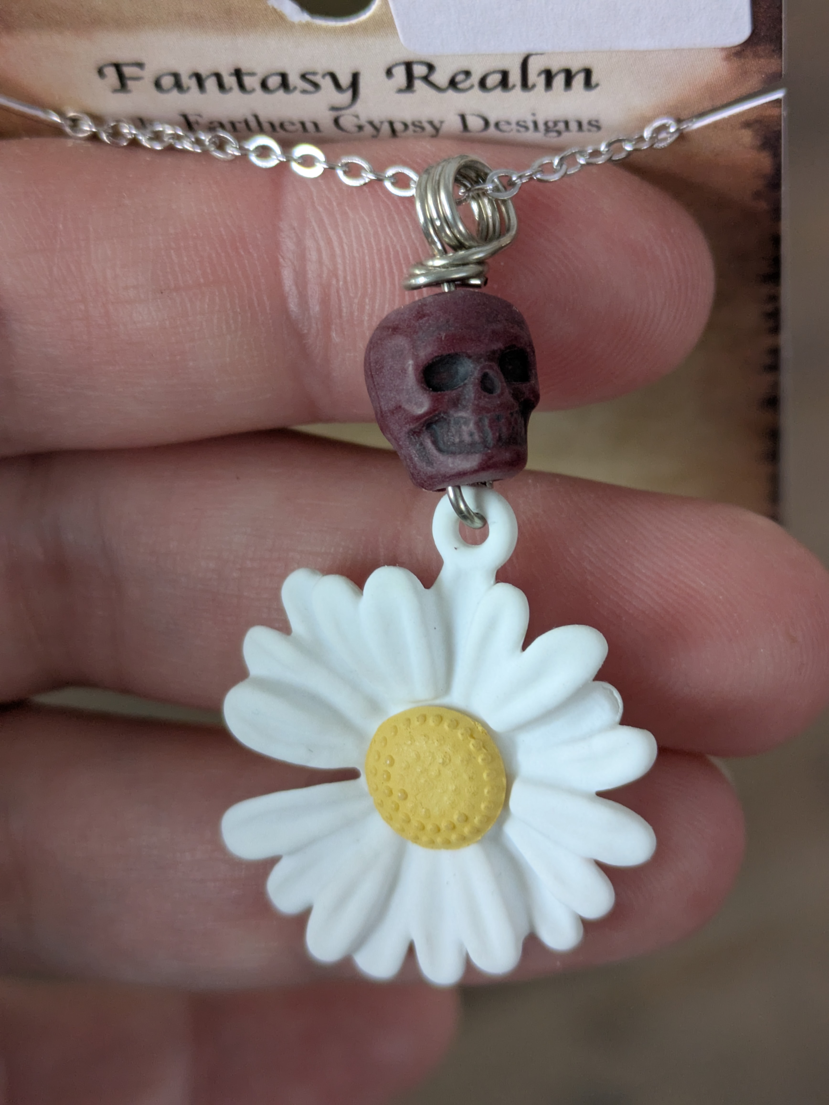 Dainty necklace made with a acrylic skull bead and acrylic daisy charm.