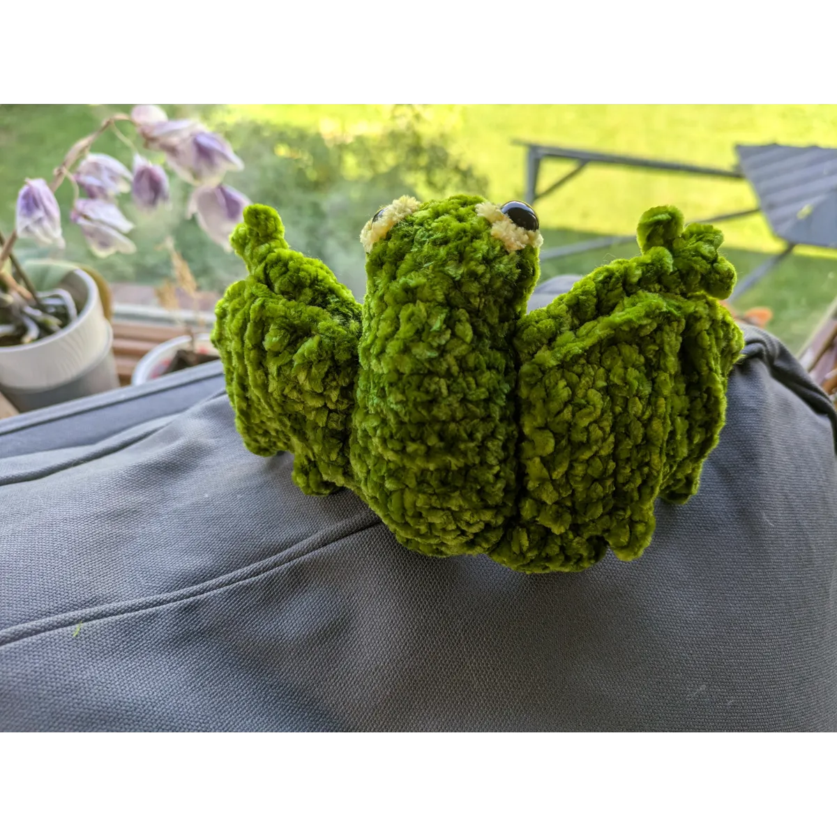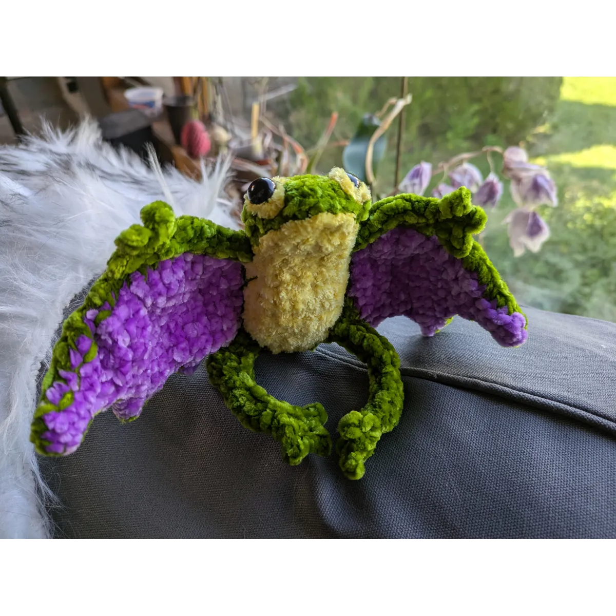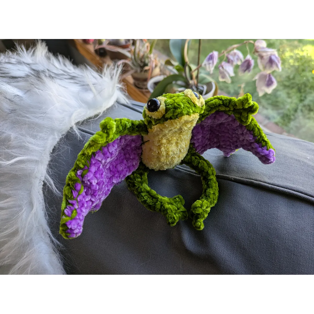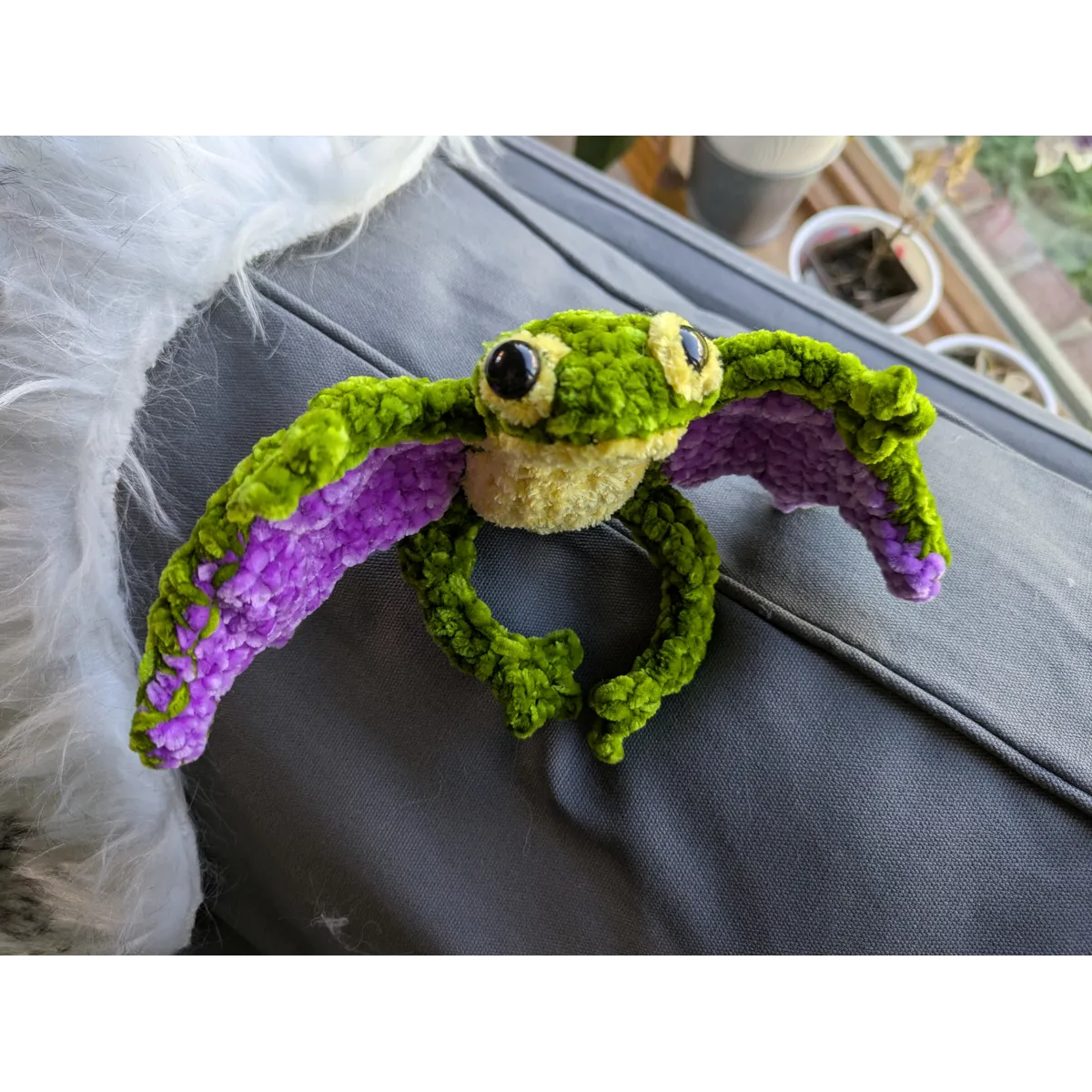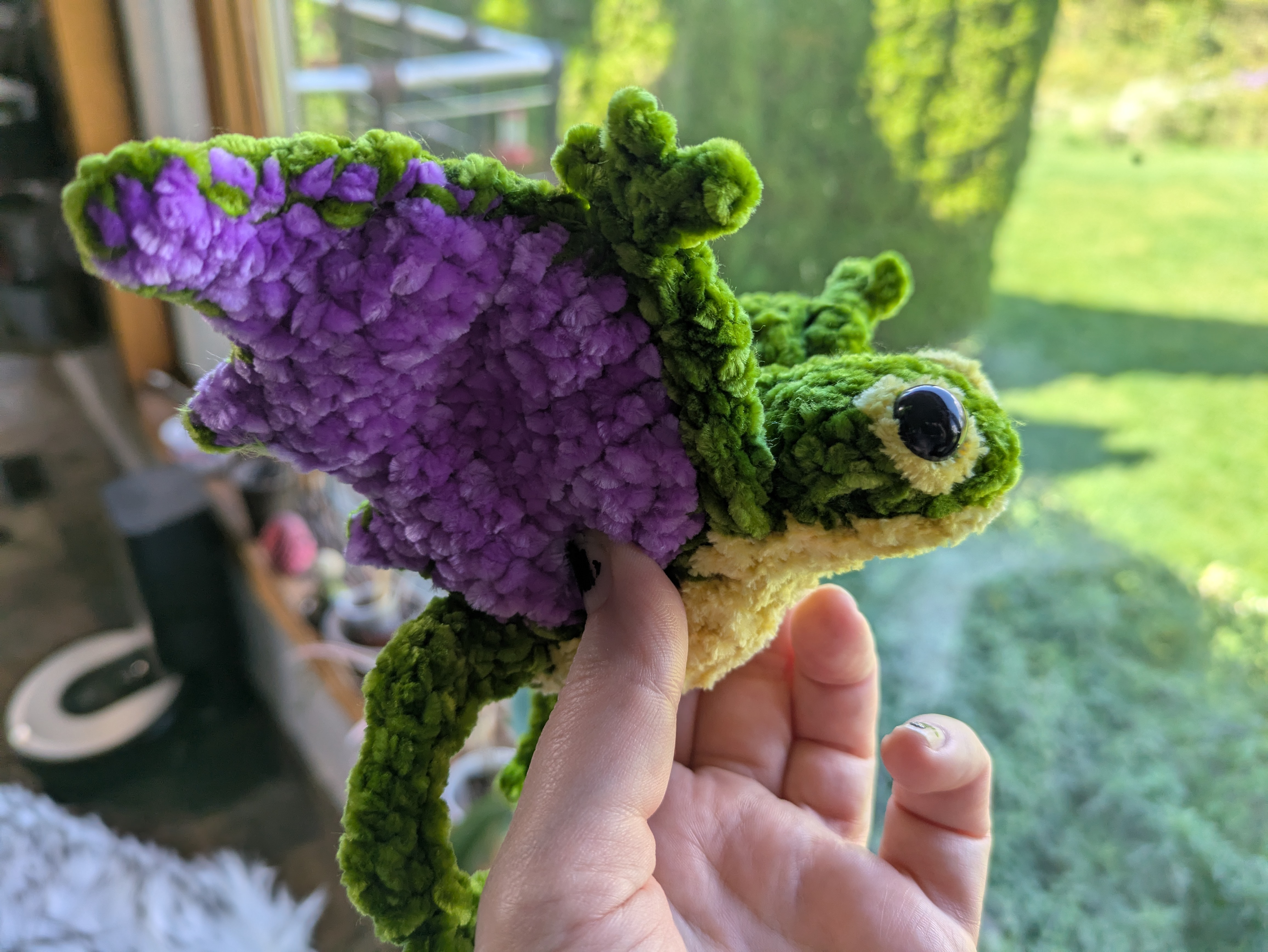 Crocheted using chenille yarn and safety eyes. About 6 inches tall.