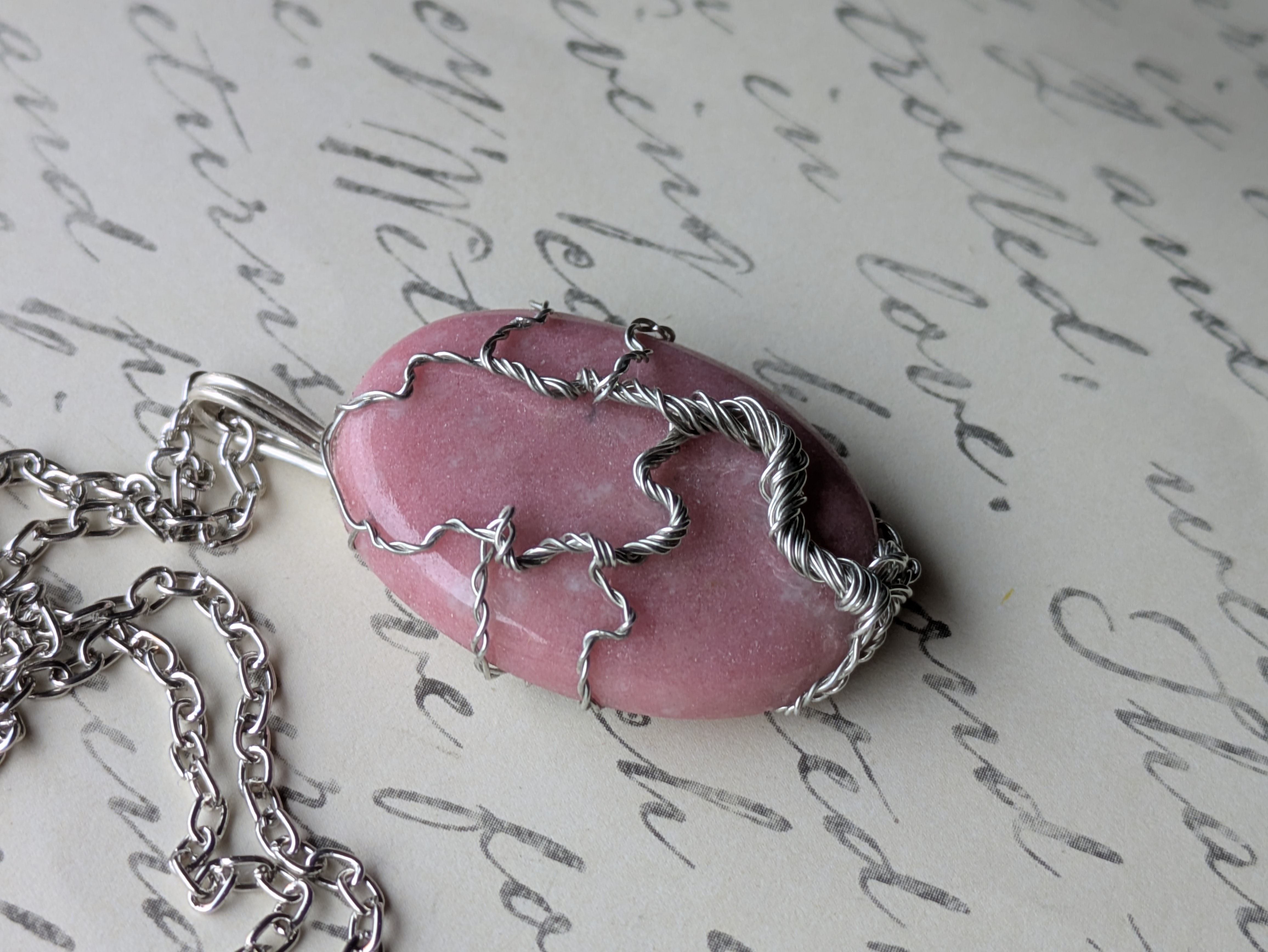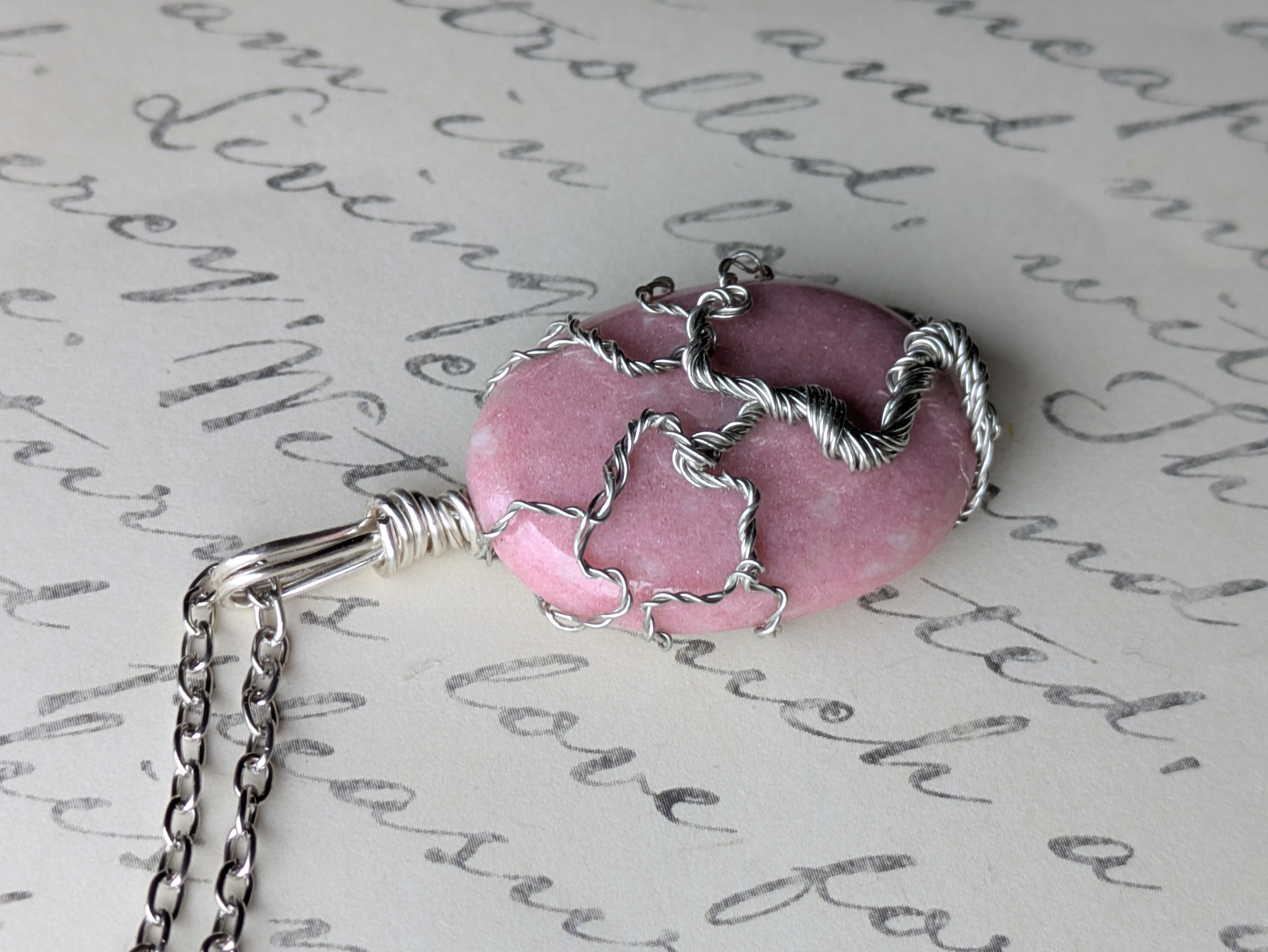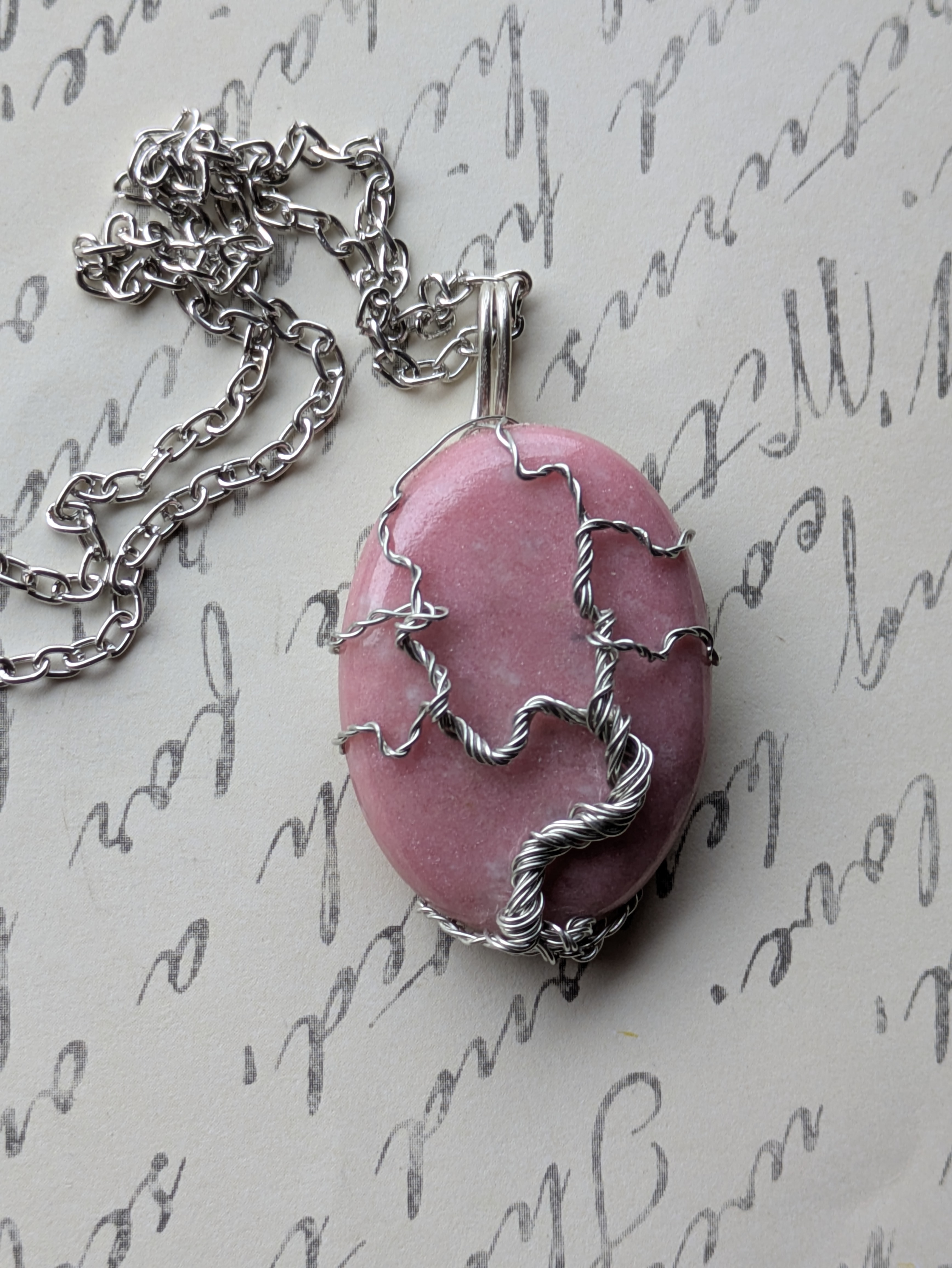 Materials: thulite; silver coated copper wire; metal alloy of copper, bronze, zinc, tin;