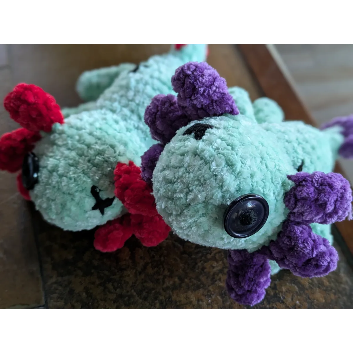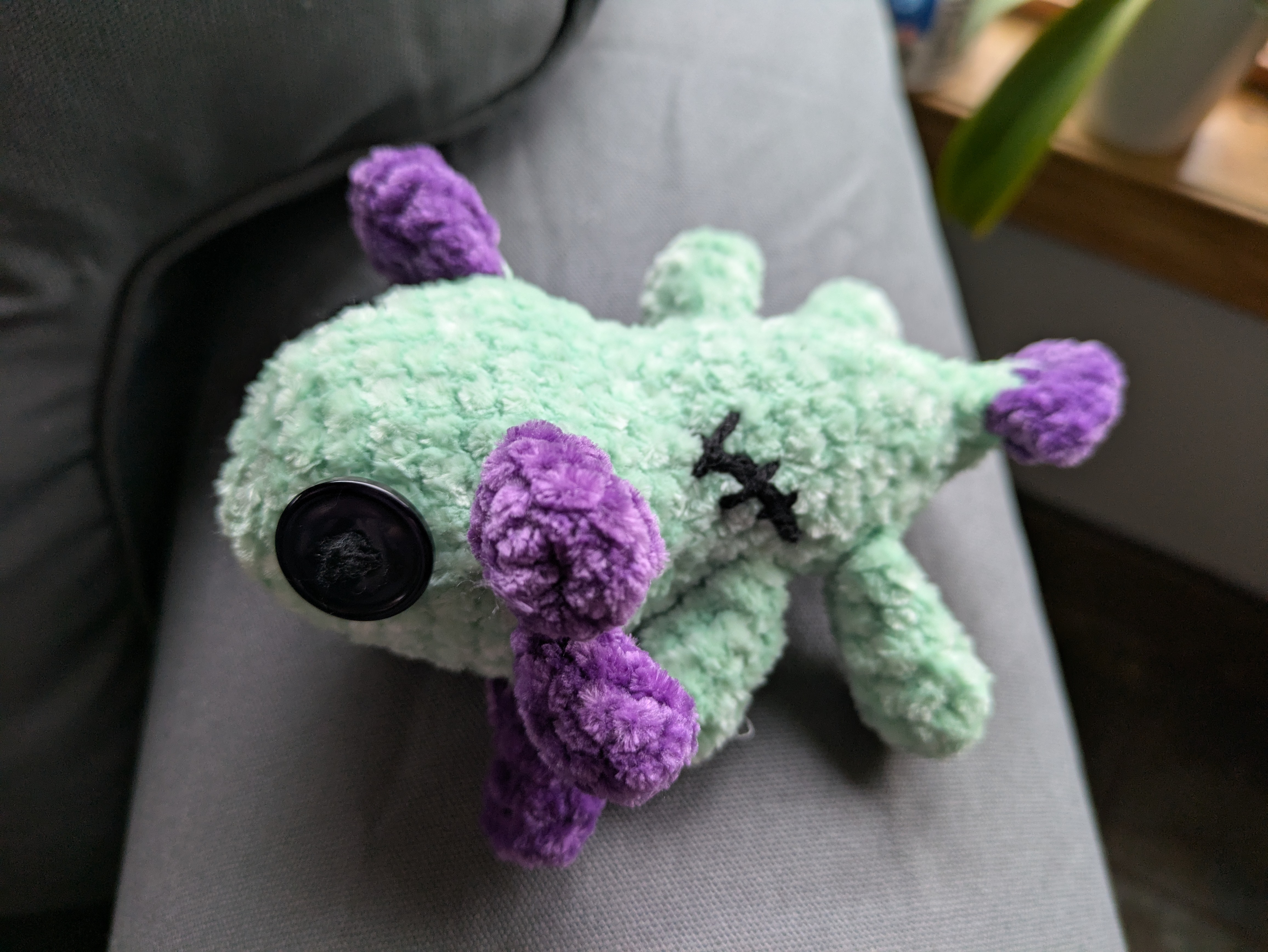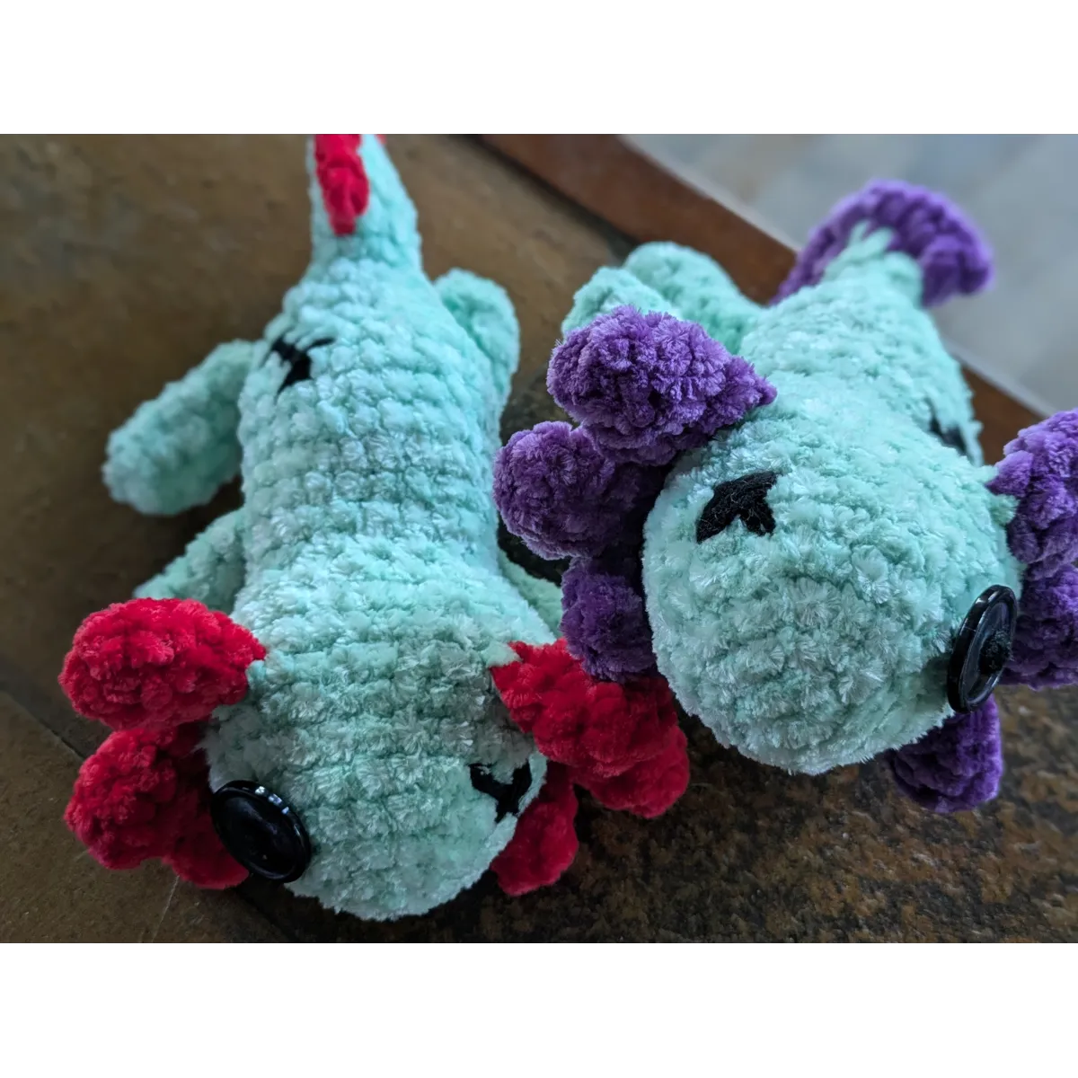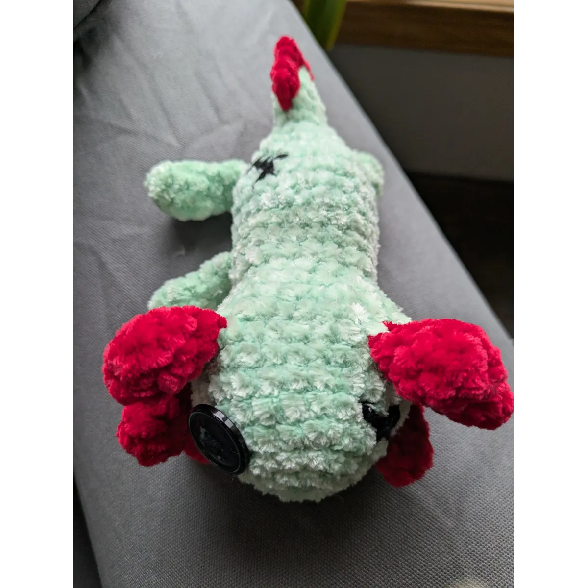 Crocheted using chenille yarn. One eye is a button and one is cross-stitched. About 6 inches long. Please allow for very slight variations as this is a handmade plushie.