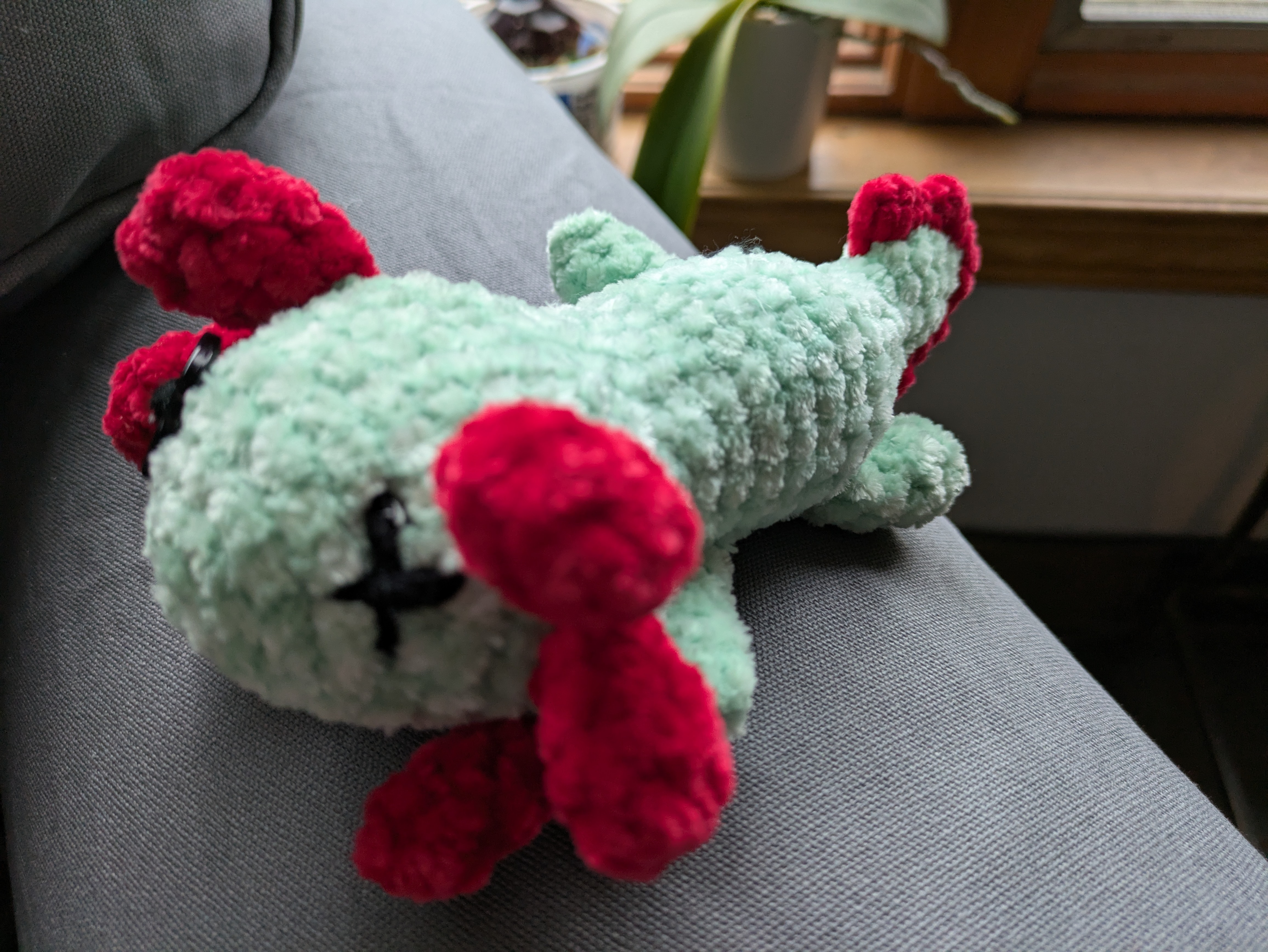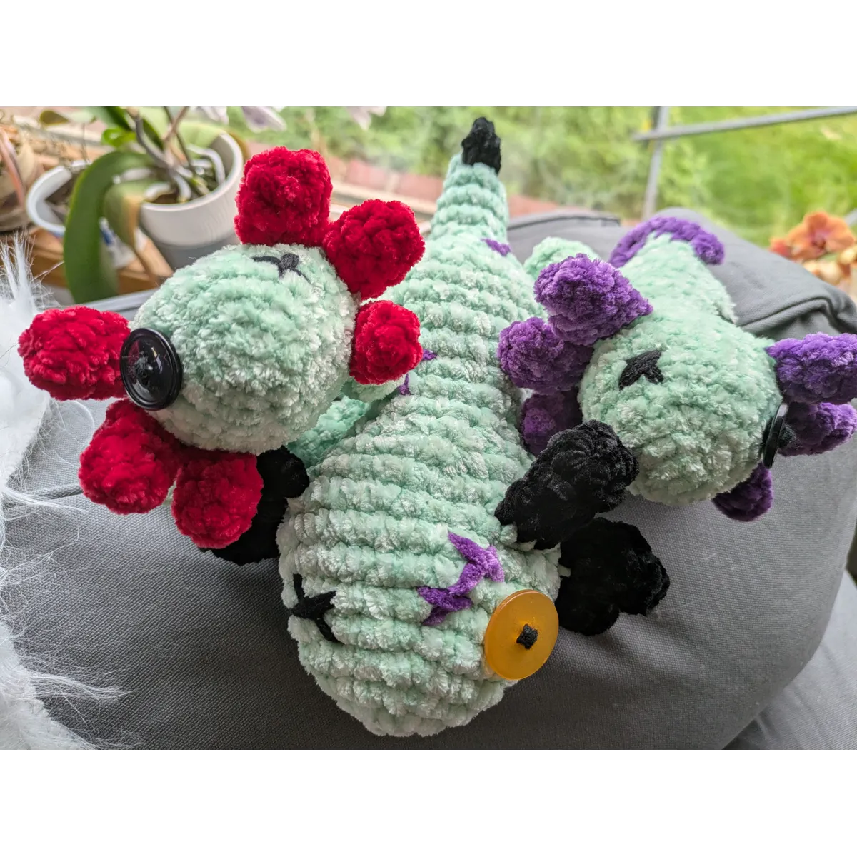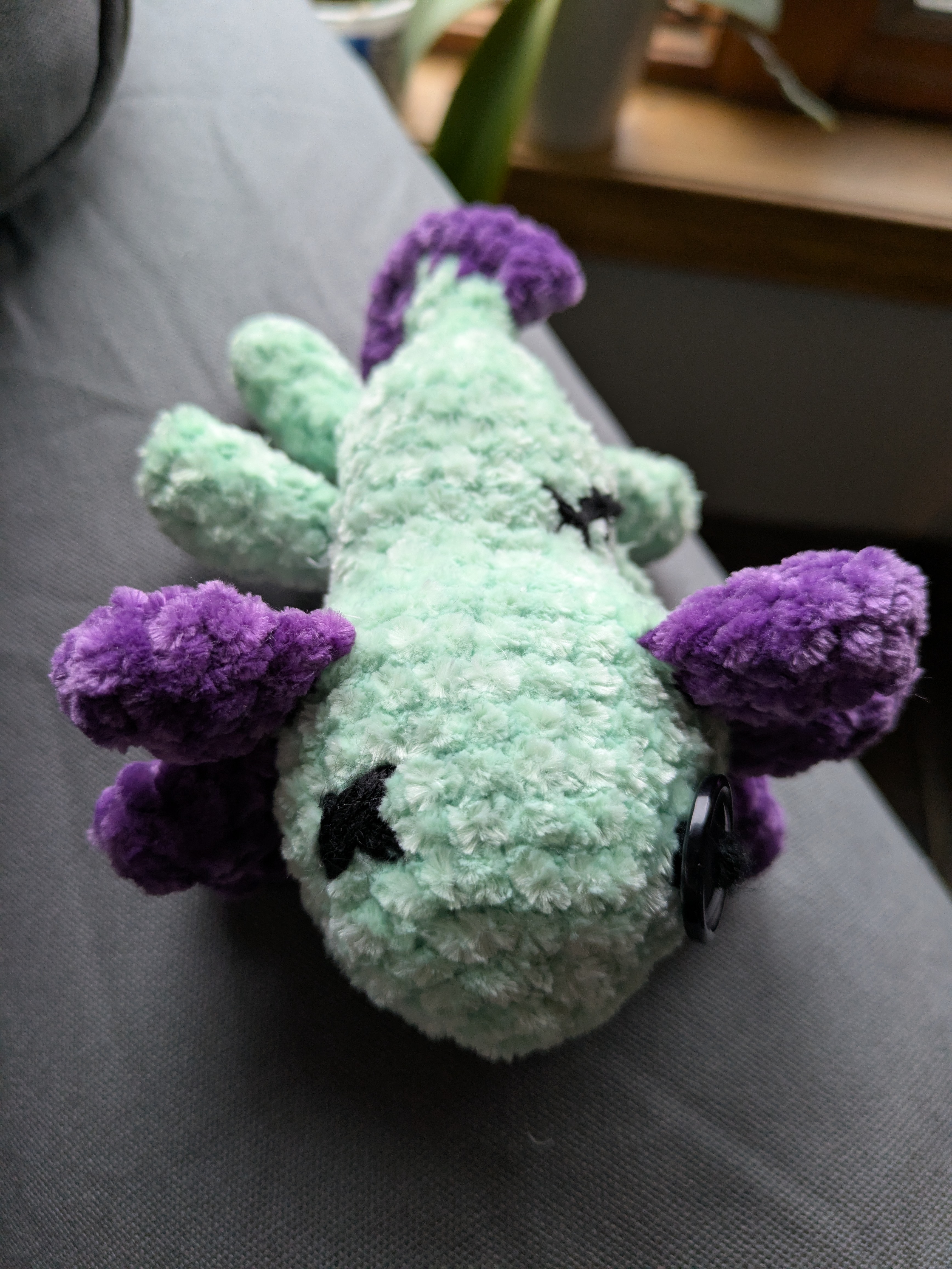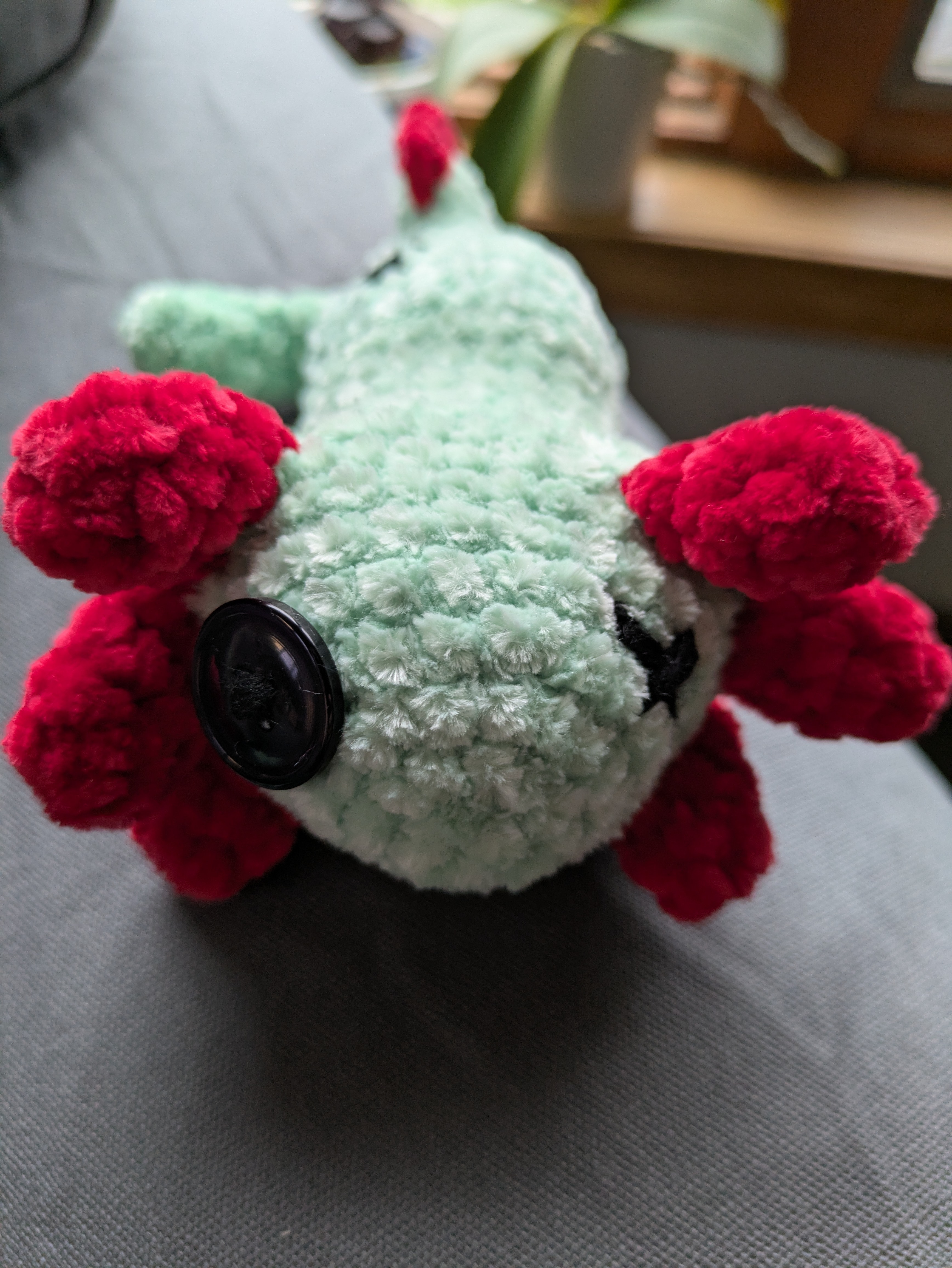 Crocheted using chenille yarn. One eye is a button and one is cross-stitched. About 6 inches long. Please allow for very slight variations as this is a handmade plushie.